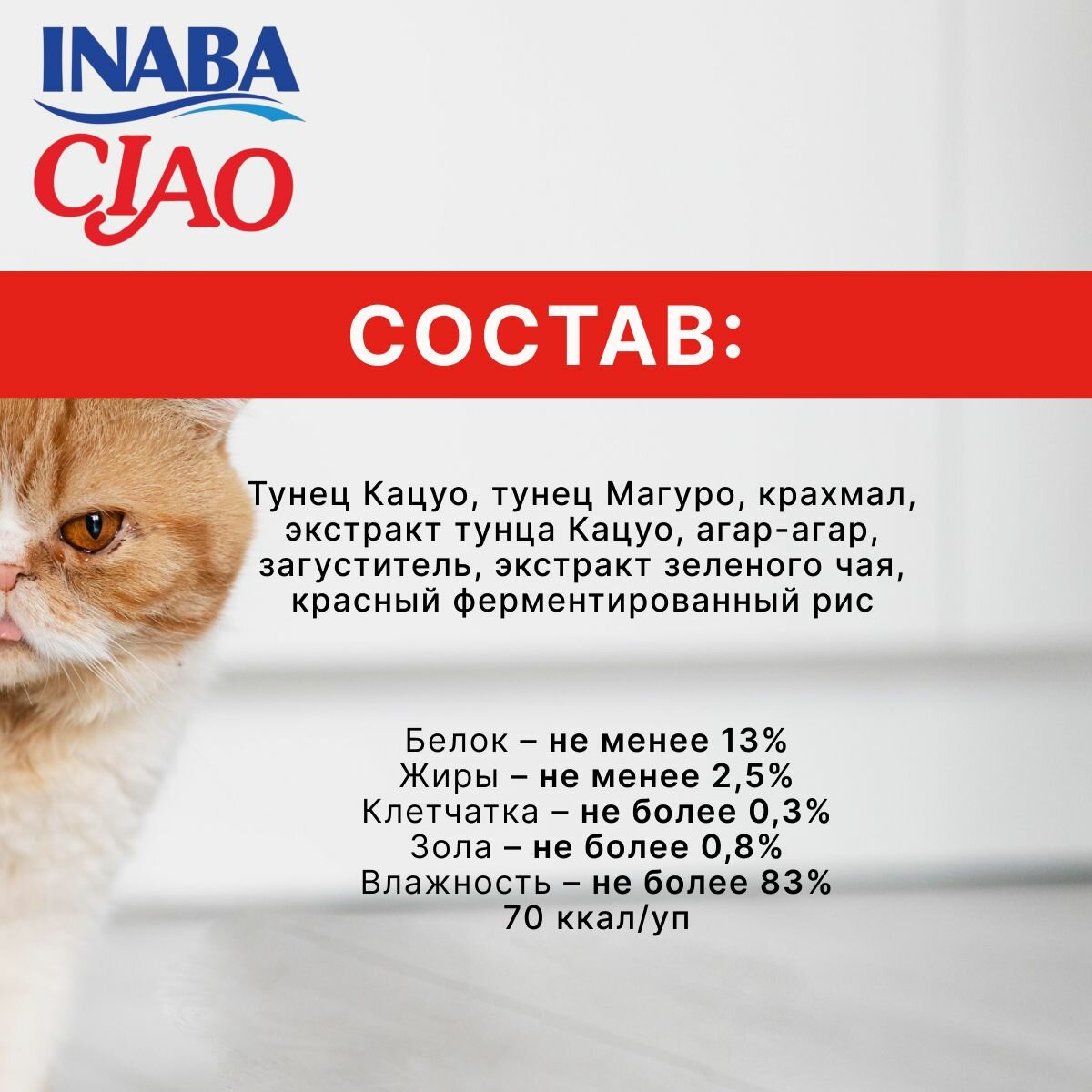 | Состав | Состав: тунец Кацуо, тунец Магуро, крахмал, экстракт тунца Кацуо, агар-агар, загуститель, экстракт зеленого чая, краситель (красный ферментированный рис) Аналитический состав: белки - 13%, жиры - 2,5%, клетчатка - 0,3%, зола - 0,8%, влажность- 83% Упаковка рассчитана на 1 кормление взрослой кошки среднего размера. Рекомендованная норма кормления до 2 упаковок в день как дополнение к полнорационному корму. Вскрытый пакетик хранить в холодильнике не более 24 часов. |