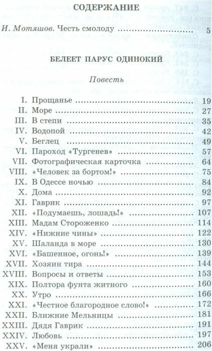 Повесть "Белеет парус одинокий" переносит читателя в Одессу начала XX века, в самую бурю событий первой русской революции. Герои повести Петя и Гаврик - обыкновенные одесские мальчишки, с которыми на страницах книги происходит немало разных, необычных и важных, серьезных и веселых приключений. Повесть включена в перечень "100 книг по истории, культуре и литературе народов Российской Федерации, рекомендуемых школьникам к самостоятельному прочтению".