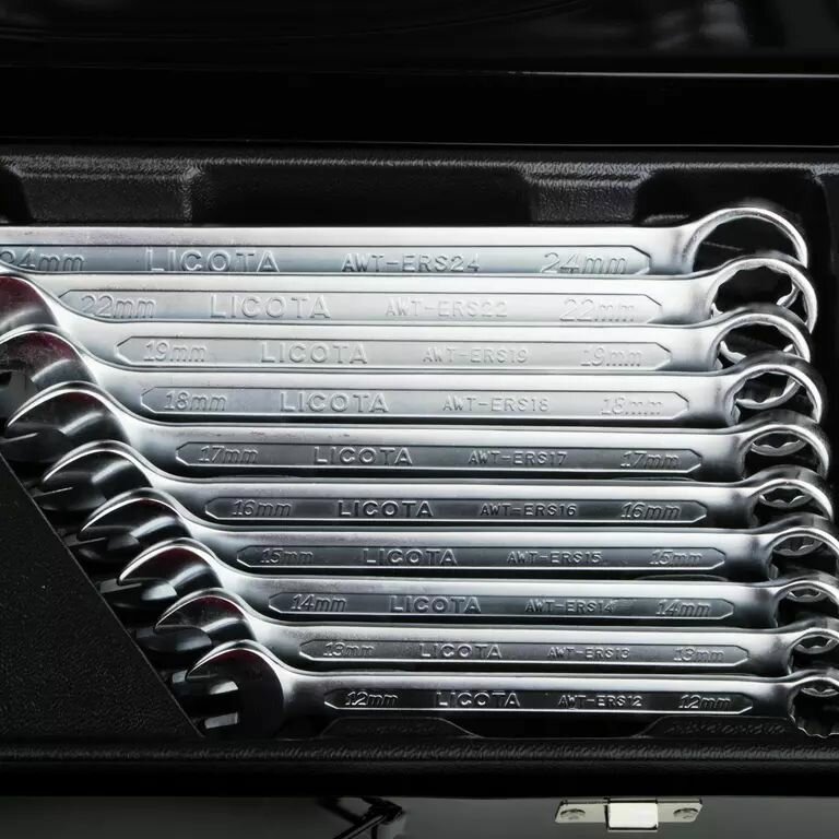 Набор комбинированных ключей Licota из 16 предметов 6-24 мм в металлическом ящике для использования в автомастерских или для работы с крепежом на производстве.