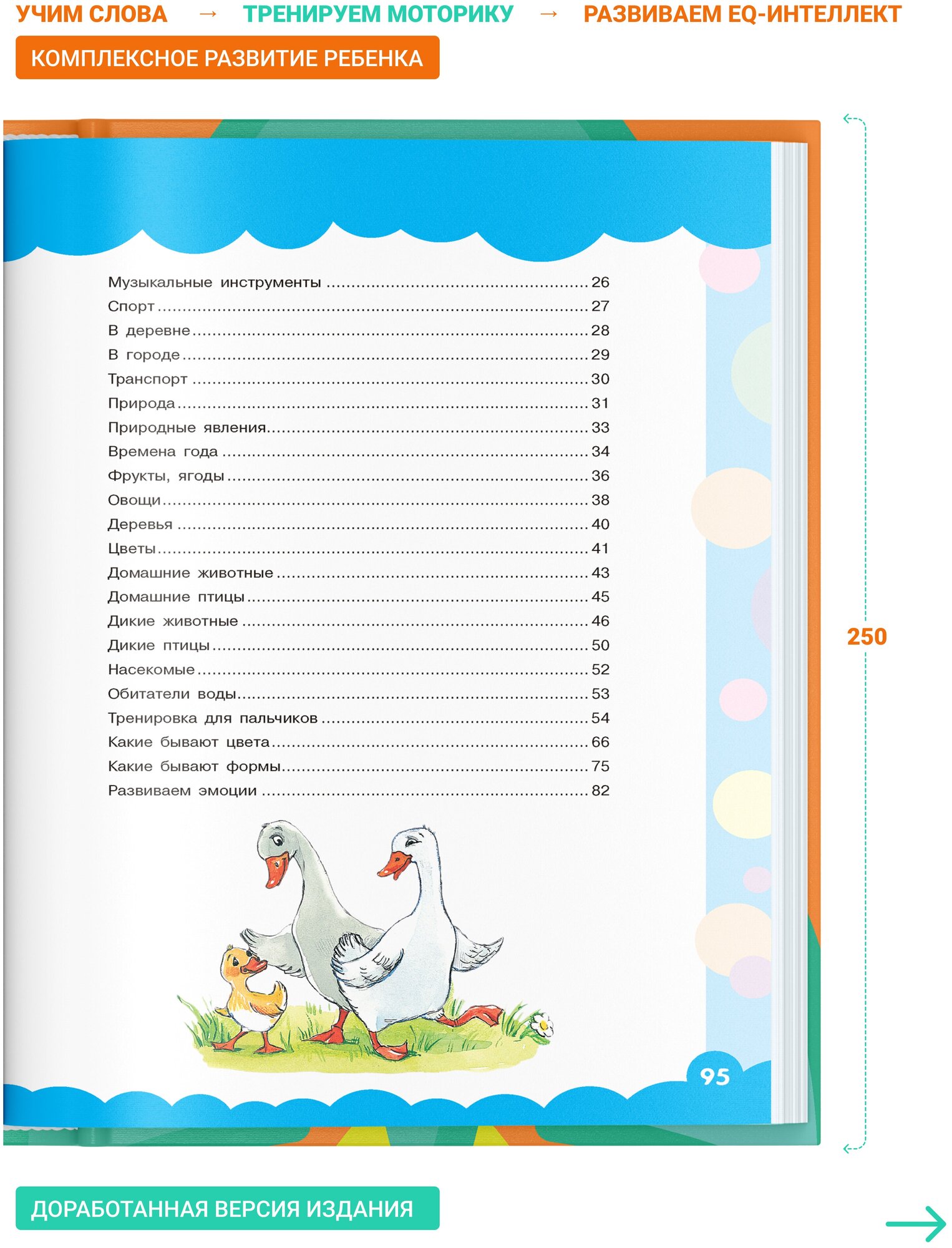 Книга "Мои первые слова в картинках" поможет ребенку развить речь и моторику рук, различать цвета и формы, а также понимать эмоции свои и других людей. Она станет хорошим другом и помощником для детей, которые еще познают мир. Здесь представлены как вполне доступные вещи: игрушки, мебель, посуда, одежда, обувь, так и более сложные: человек, животные, растения, музыка, спорт и т. д.