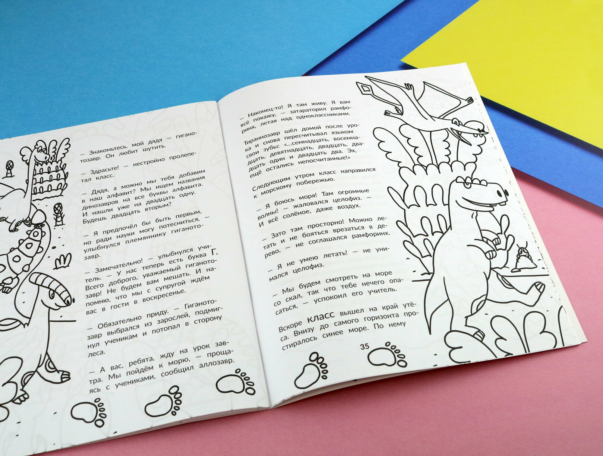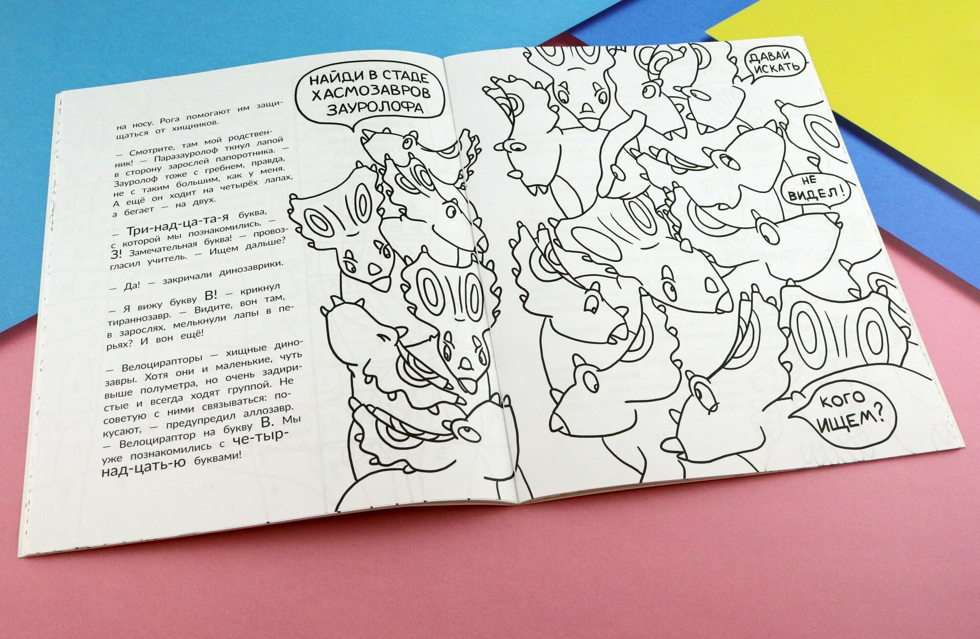 Обложка с динозаврами, поэтому не смогли пройти мимо. Оказалось, что это еще и раскраска, купили не раздумывая. Такая книжка определенно развивает и творческие, и умственные способности, потому что здесь и раскраска, и добрая поучительная история о дружбе, и развивающие задания, и даже постер с алфавитом, который мы вытащили из книги и сразу повесили на стену, хотя буквы уже давно знаем. Но на плакате нарисованы все динозавры и их названия, поэтому, как сказал ребенок, плакат очень ценный. Плакат цветной, а книжка черно-белая, потому что это раскраска.