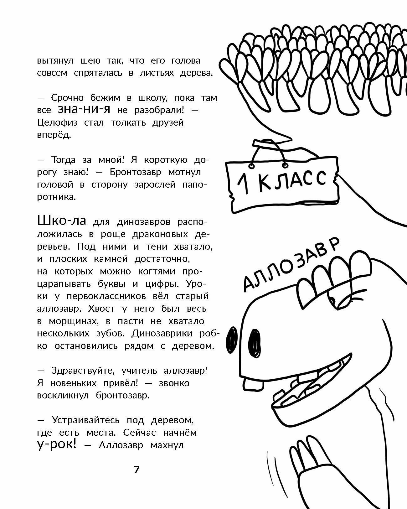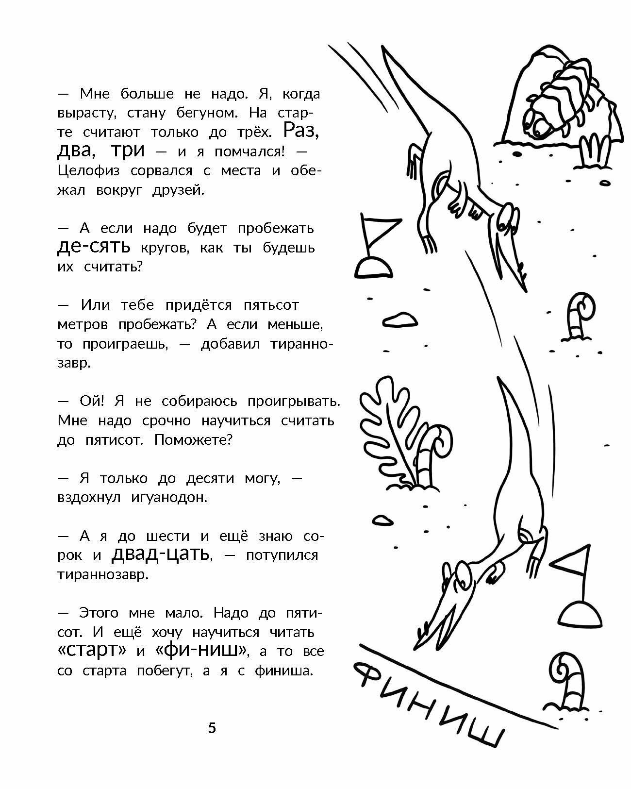 Это третья раскраска из этой серии про динозавров. Две другие у нас уже есть, ребенок с большим удовольствием их раскрашивал и решал задачки, поэтому третью тоже купили. Здесь главный герой – тираннозавр, который в первый раз пришел в школу. Динозаврики на первом уроке сомневаются, что школа им нужна: это скучно, нет места играм, нужно чему-то учиться. Но им попался отличный учитель, который показывает, что школа – это интересно и полезно. Если ты хочешь стать бегуном, то как же сможешь добежать до нужного места, если не умеешь читать и не прочитаешь слово «финиш»? Из плюсов раскраски: сложные слова написаны большими буквами и по слогам, детям так легче читать