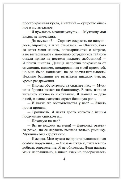Удобный карманный формат. Легко носить и читать. Детективно-любовная история. Ей заплатили, отправили вместо другого человека. Ей приходится играть роль, при этом самой выяснять подноготную героя, действовать вопреки требованиям работодателя. Ну и конечно- признания и счастливый конец