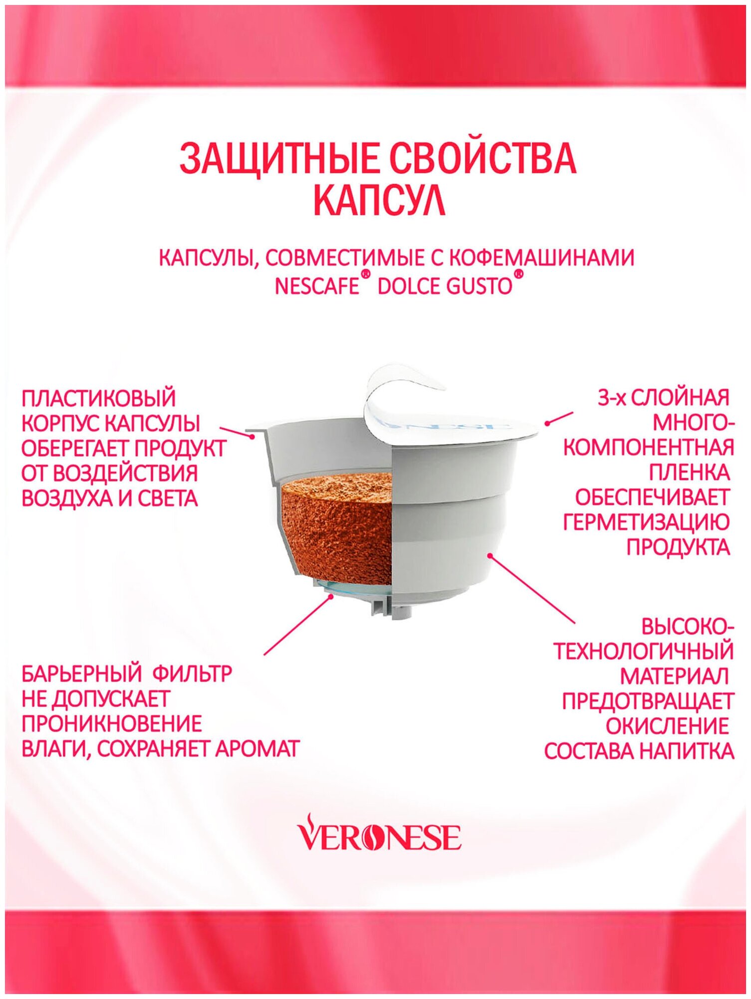 Кофе Veronese в капсулах Dolce Gusto Raf Coffe Forest Raspberries – новая, согревающая и ароматная коллекция капсульного кофе от Veronese. Бодрящий эспрессо в сочетании со сливочной пенкой и ароматом лесной малины подарит незабываемые ощущения тепла и уюта. Кофе изготовлен из зерен арабики и обладает насыщенным ароматом. Восхитительное сочетание горячего молока, насыщенного кофе и бархатистой молочной пенки не оставит вас равнодушными.