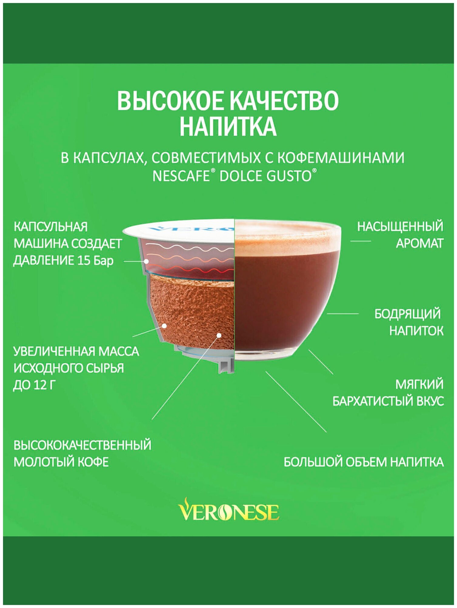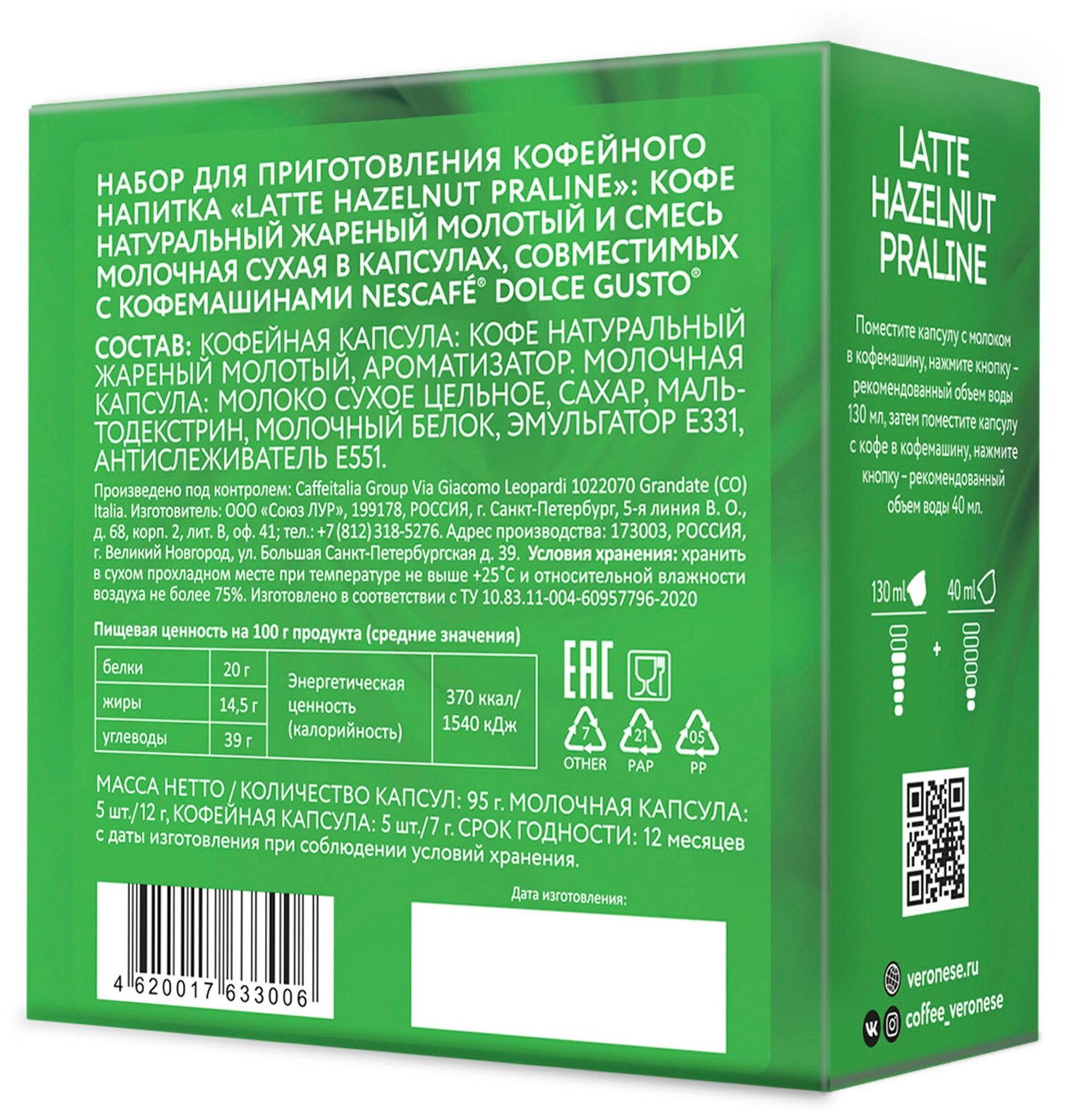 Кофе Veronese в капсулах Dolce Gusto Latte Hazelnut Praline - откройте для себя сливочный и ароматный латте с пралине из лесных орехов с мягким сочетанием эспрессо, сливочного вкуса пралине из лесных орехов и пышной молочной пены. Кофе изготовлен из зерен арабики и обладает насыщенным ароматом. Восхитительное сочетание горячего молока, насыщенного кофе и бархатистой молочной пенки не оставит вас равнодушным! Капсулы Veronese Latte Hazelnut Praline позволяют легко и просто приготовить кофе, который состоит из нескольких слоев, как в любимой кофейне. Для создания слоистого узора рекомендуется поместить в кофемашину сначала молочную капсулу, а затем кофейную. Украсьте готовый напиток по желанию шоколадной крошкой или корицей и насладитесь чашечкой орехового Latte Hazelnut Praline. В упаковке 10 капсул: 5 капсул с натуральным молотым жаренным кофе и 5 молочных капсул.