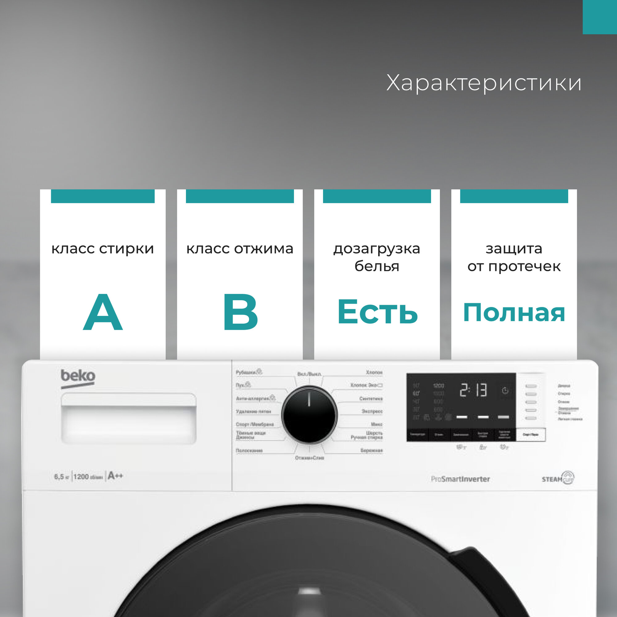 | Стирка | 6.5 кг, 1200 об/мин |