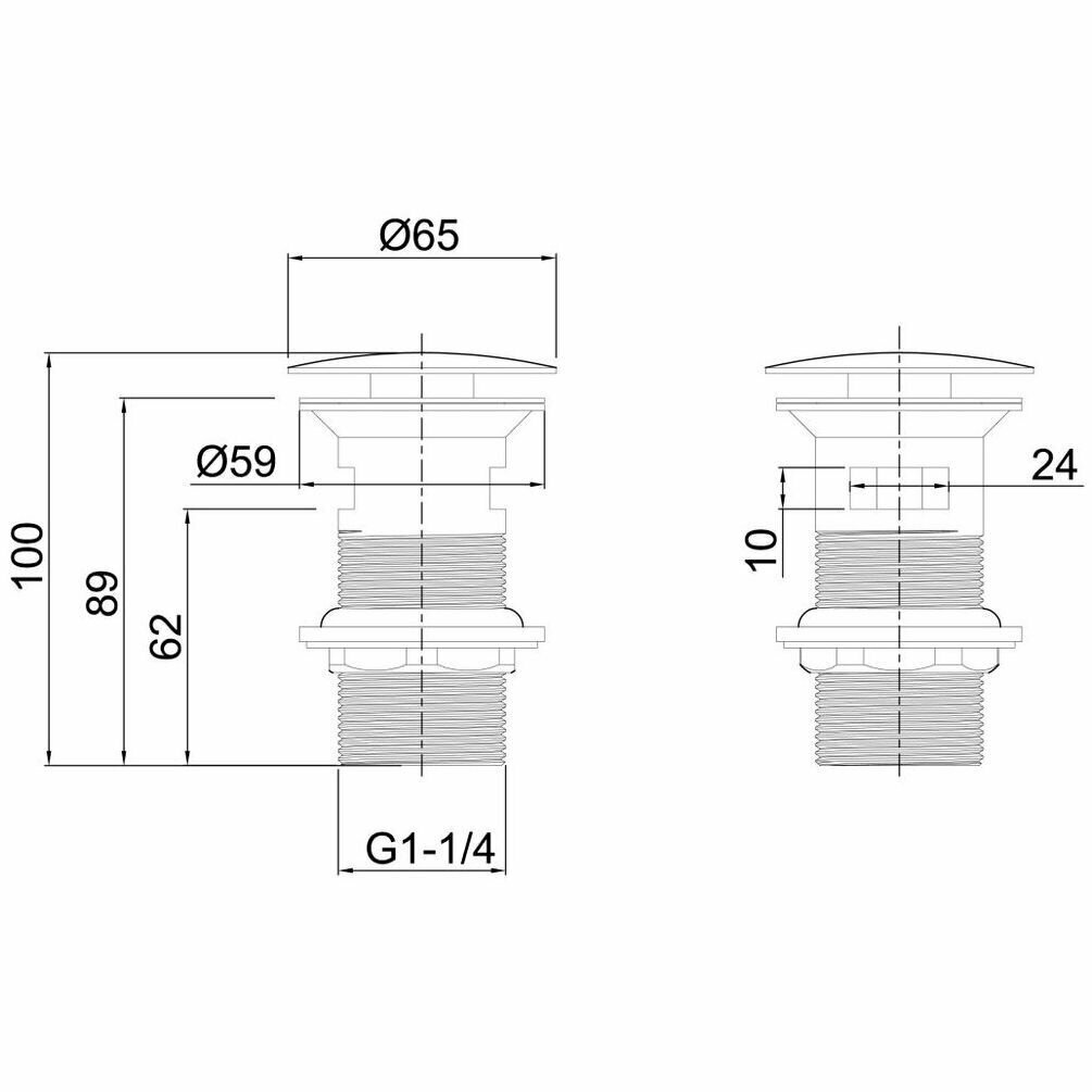 Донный клапан для раковины. Габариты (Ш В): 6.5x10 см. Подключение к сифону: 3.2 см. С отверстием для подключения перелива, позволяющего выпускать воду из раковины при ее переполнении через отверстие в нижней части перелива. Система клик-клак, управляется нажатием на пробку слива. Круглая заглушка.