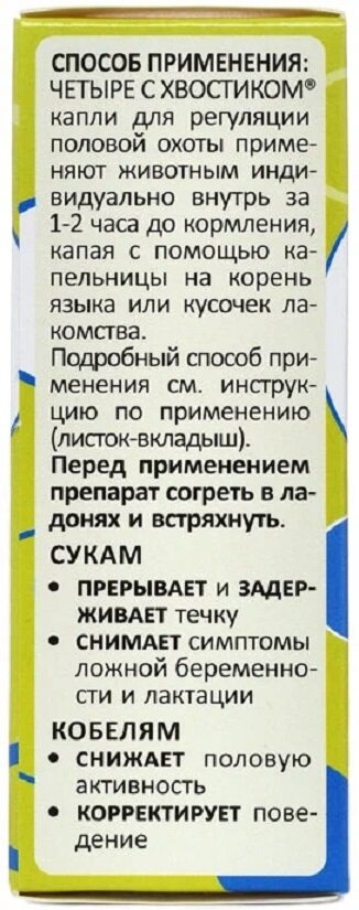 «Четыре с хвостиком» капли для регуляции половой охоты и таблетки применяют сукам и кошкам для задержки и прерывания течки, а также кобелям и котам для снижения половой активности и коррекции поведения.