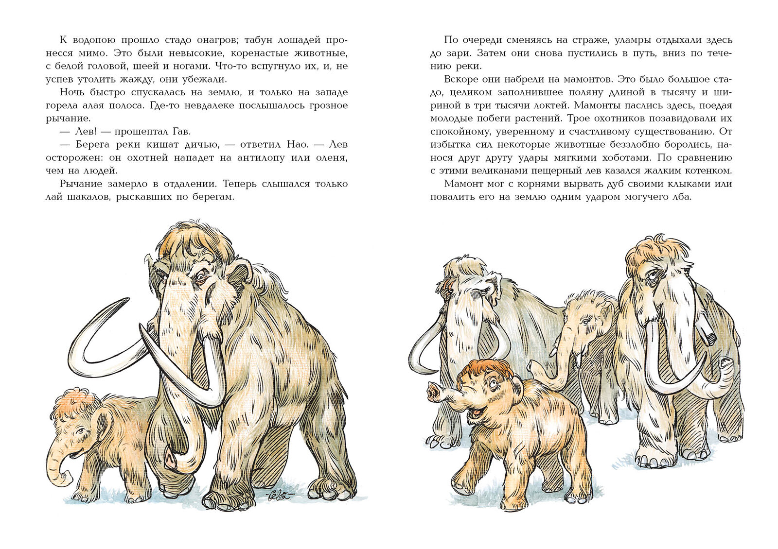 Купила эту книгу "на вырост" детям из сентиментальных побуждений. Хорошо помню, как читала повесть в детстве и даже писала по ней сочинение. Мои дети еще "в возрасте динозавров", но ведь потом обычно просыпается интерес и к древним людям, мамонтам и прочему. Меня совершенно поразили иллюстрации Олега Селезнева, это какой-то космический уровень графики. И дело не только в сложных, проработанных, достоверных фигурах людей и зверей. Но маргиналии! Маленькие рисуночки в начале и конце глав, орнаменты, листочки, веточки и косточки - каждый штрих и деталь идеально нарисованы. Скажу честно, я просто не могла оторваться от этих рисунков. Они раскрывают текст еще ярче.