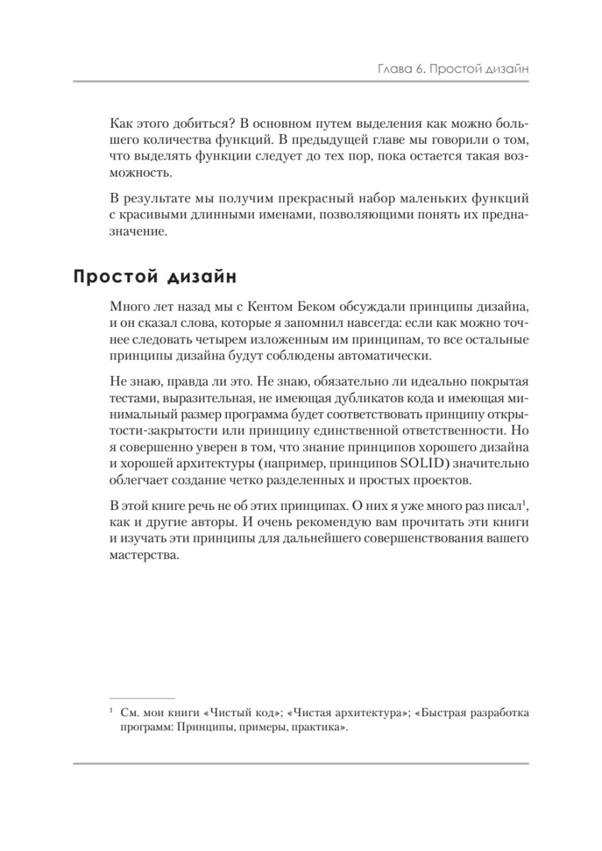 Роберт Мартин, автор бестселлера «Чистый код», начинает с прагматического руководства по пяти основополагающим дисциплинам создания программного обеспечения: разработка через тестирование, рефакторинг, простой дизайн, совместное программирование и тесты. Затем он переходит к стандартам — обрисовывая ожидания «мира» от разработчиков программного обеспечения, рассказывая, как часто различаются эти подходы, и помогает вам устранить несоответствия. Наконец, он обращается к этике программиста, давая десять фундаментальных постулатов, которым должны следовать все разработчики программного обеспечения.