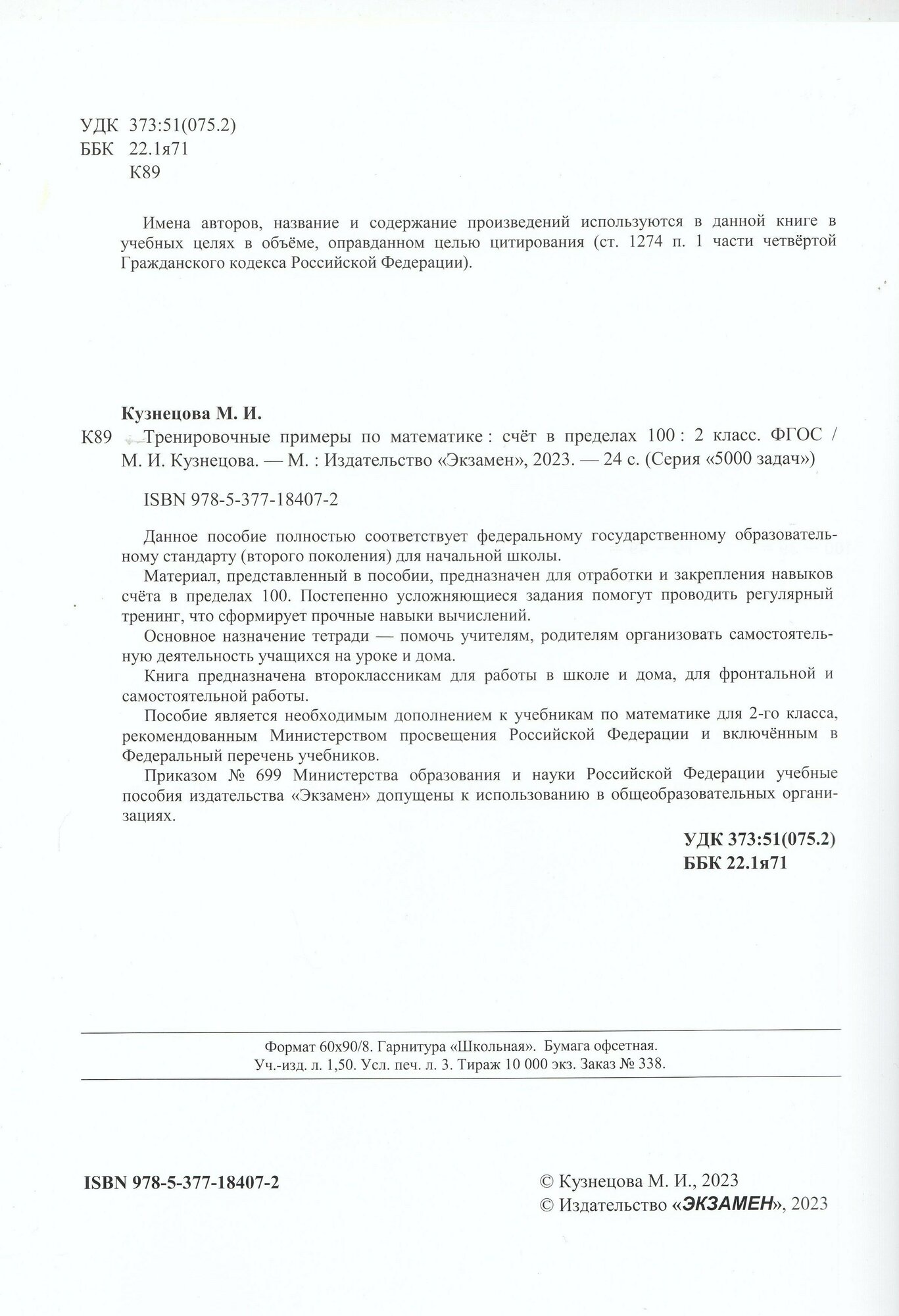 Тренировочные примеры по математике 2 класс Счет в пределах 100 (Кузнецова Марта Ивановна); Экзамен, 2023