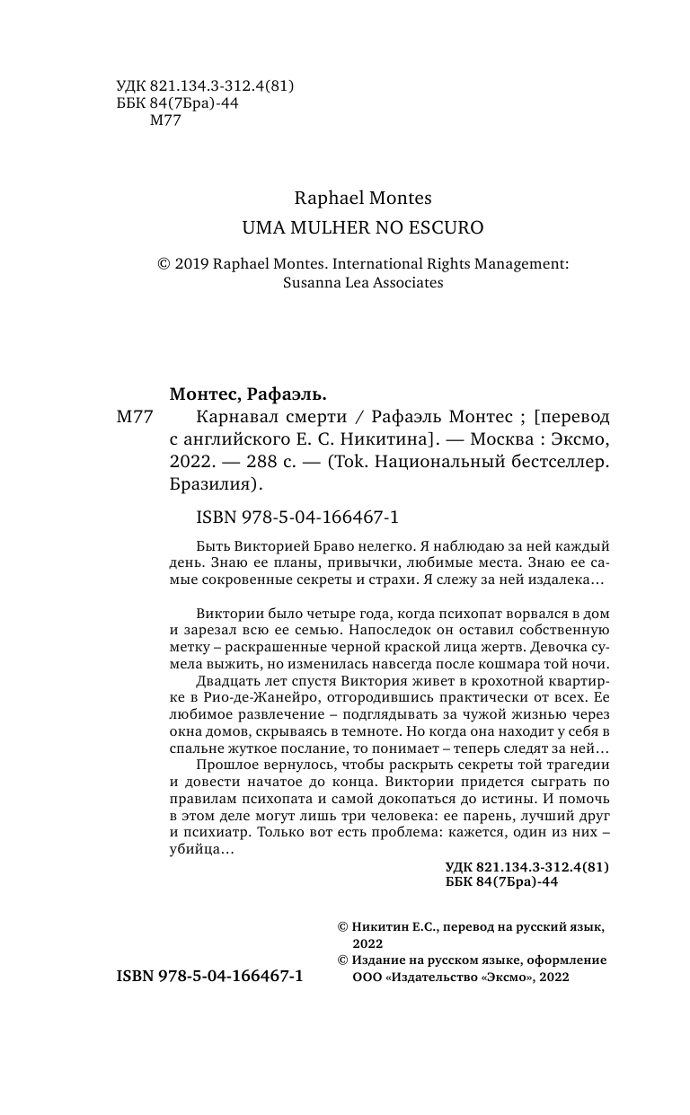 "Прочитала на одном дыхании. Я боялась за Викторию, болела за нее, а главное - понимала ее. И та глубина, с которой Рафаэль Монтес создал этого таинственного персонажа… Триллер и роман, соединенные в одном сюжете, трогают и заставляют задуматься. Блестяще!" - Илана Касой, бразильская писательница и профайлер-криминалист