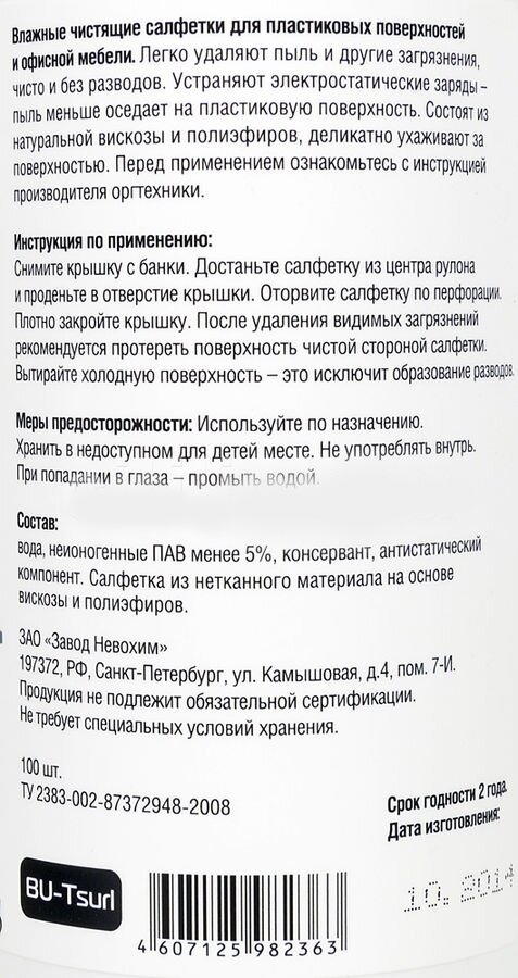 Влажные чистящие салфетки для пластиковых поверхностей и офисной мебели. Легко удаляют пыль и другие загрязнения. Не оставляют разводов. Устраняют электростатические заряды. Состоят из натуральной вискозы и полиэфиров.