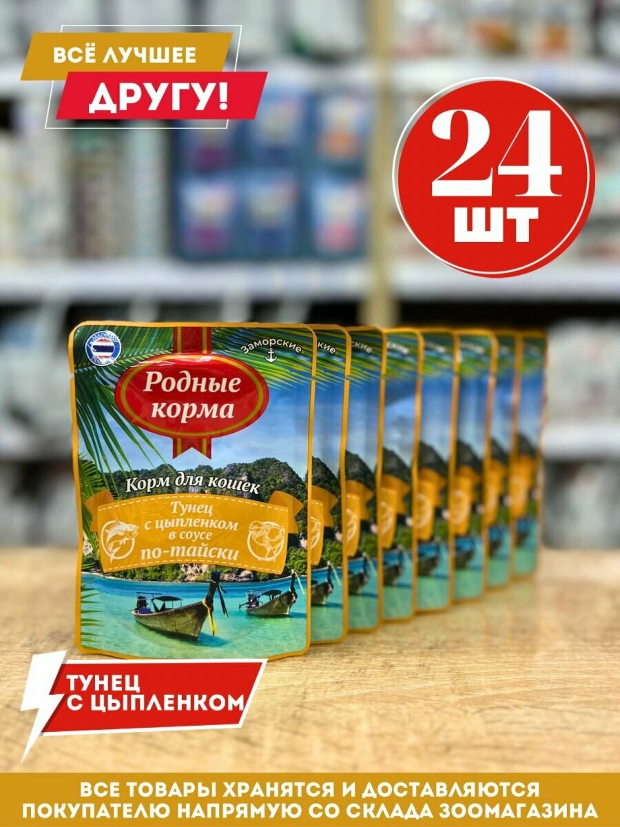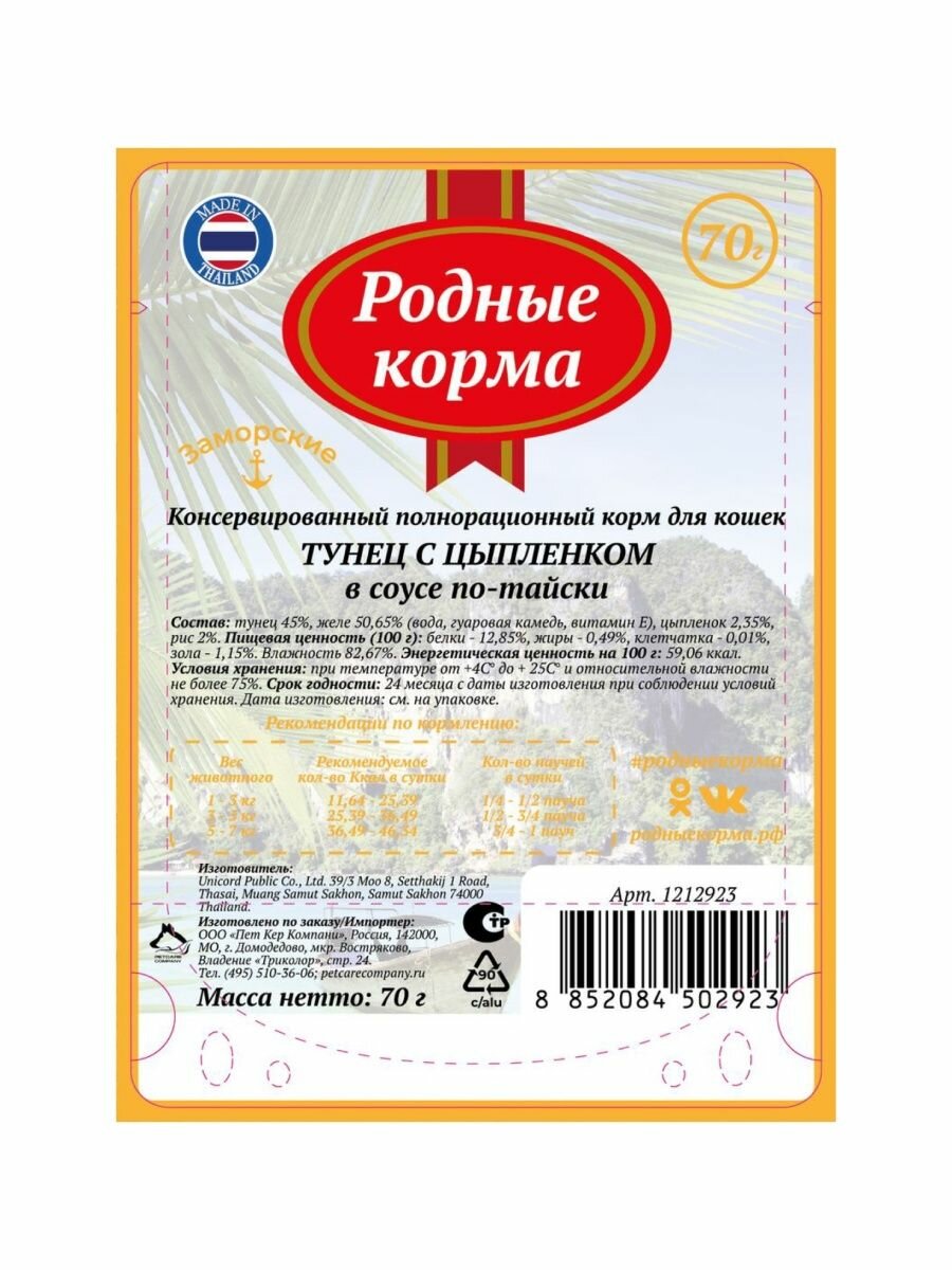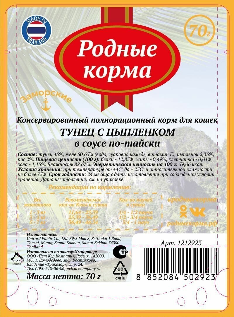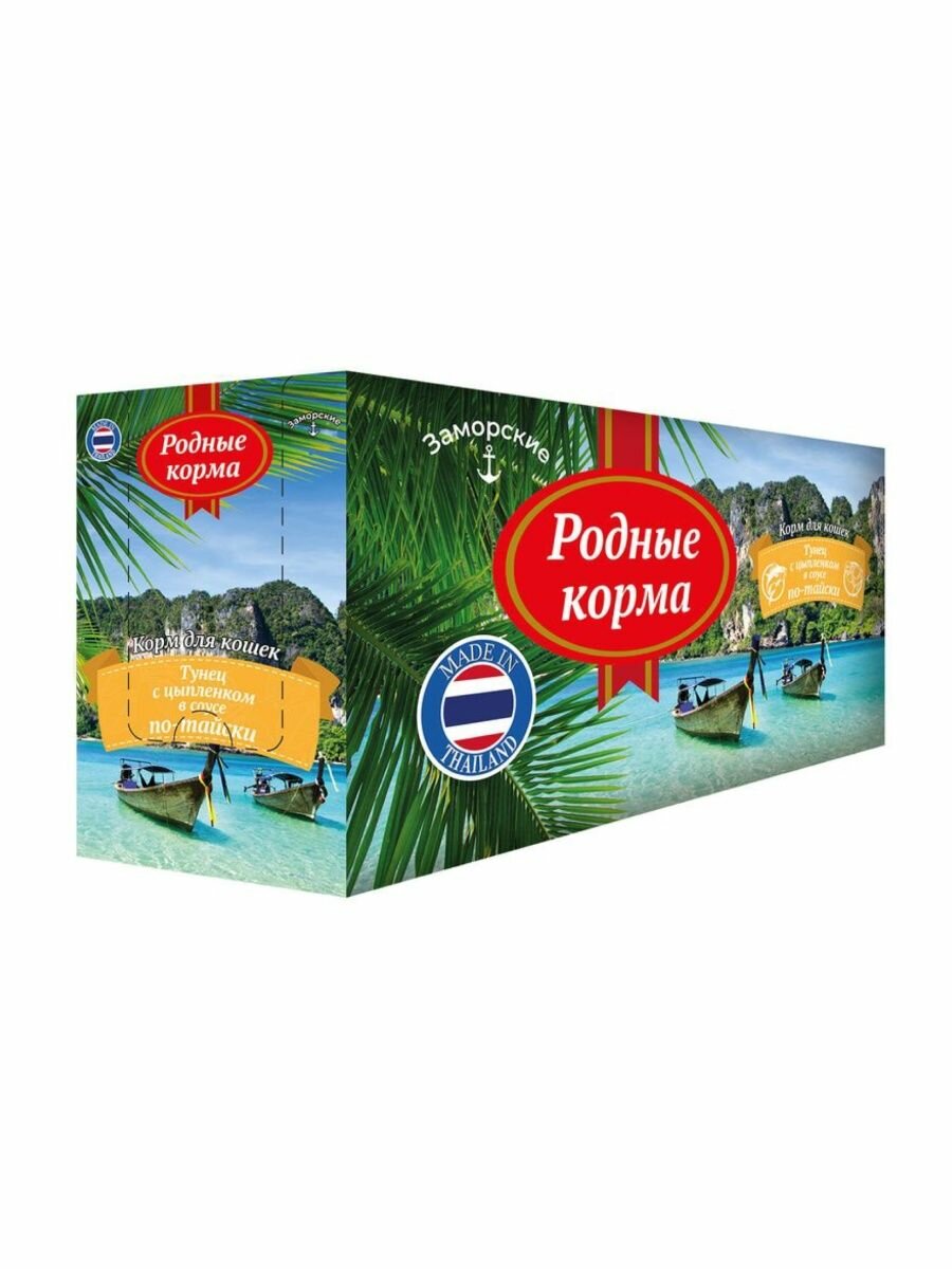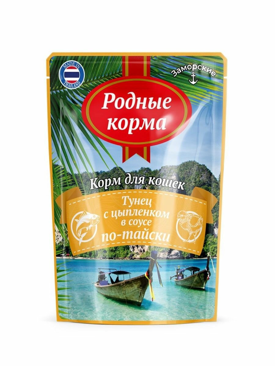 Влажный корм для кошек Родные корма Заморские Тунец с цыпленком в соусе по-тайски 70г