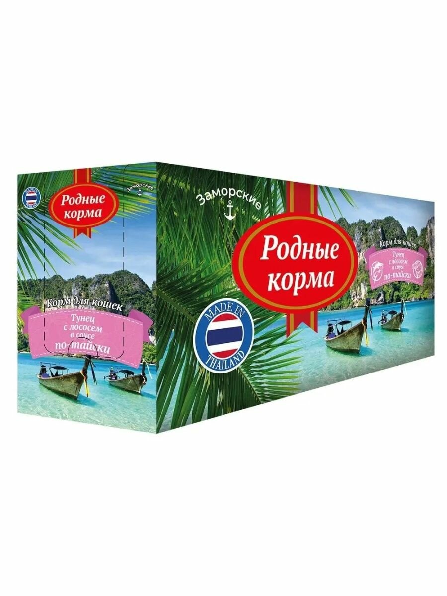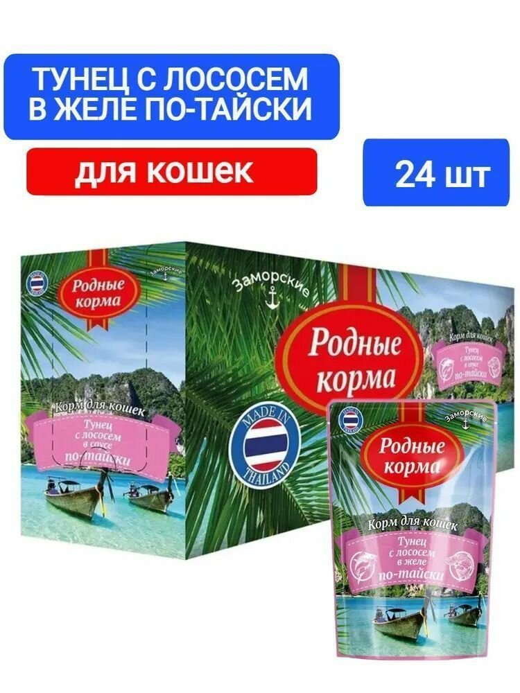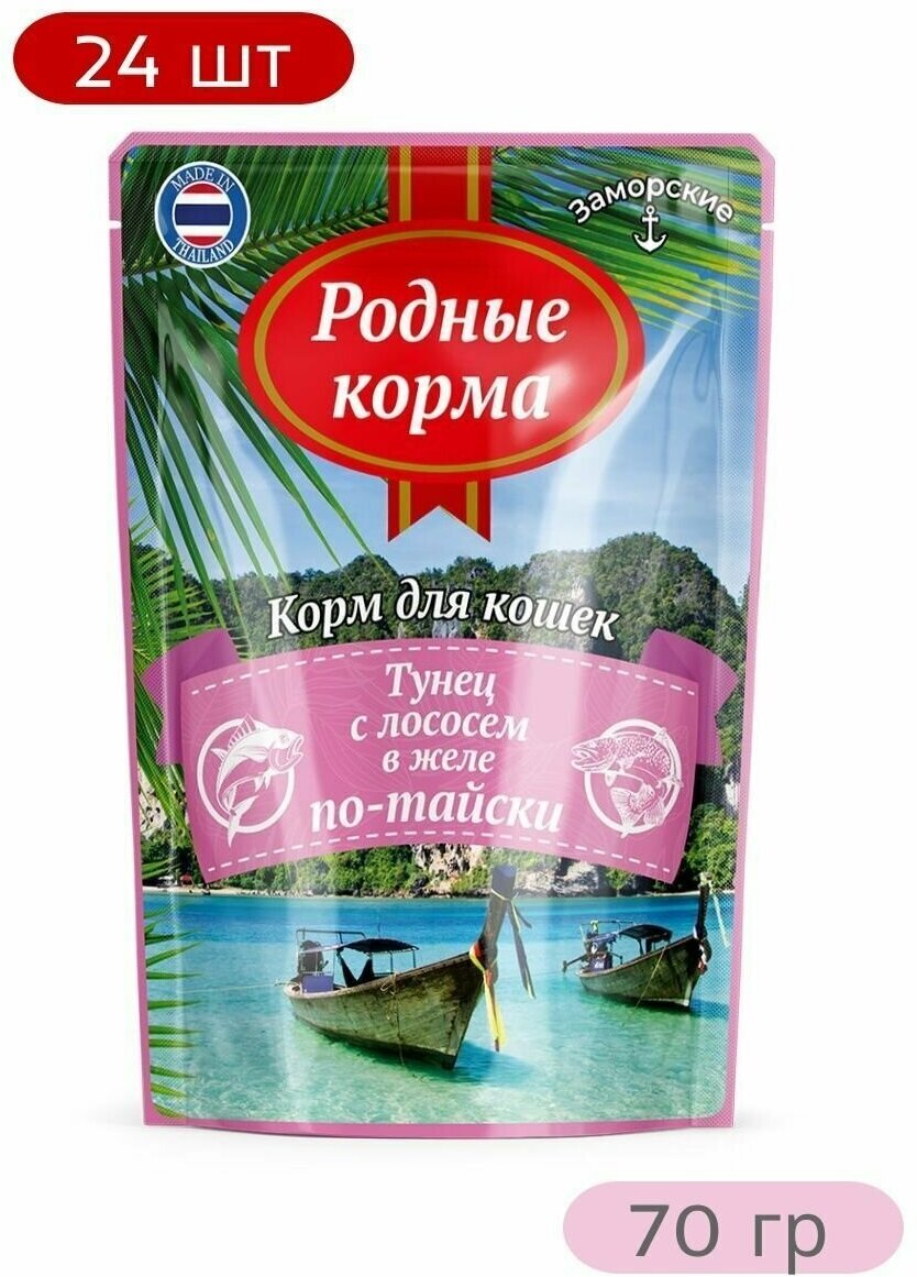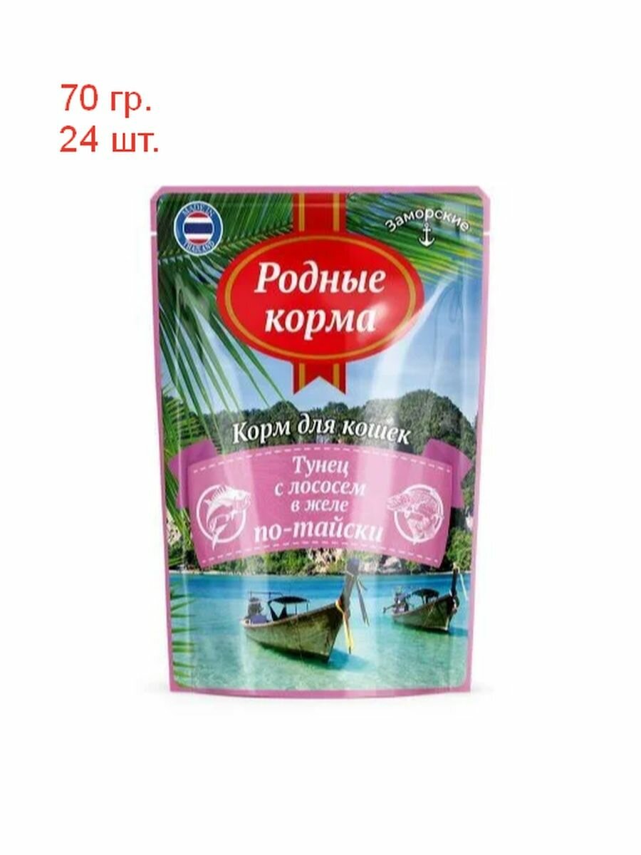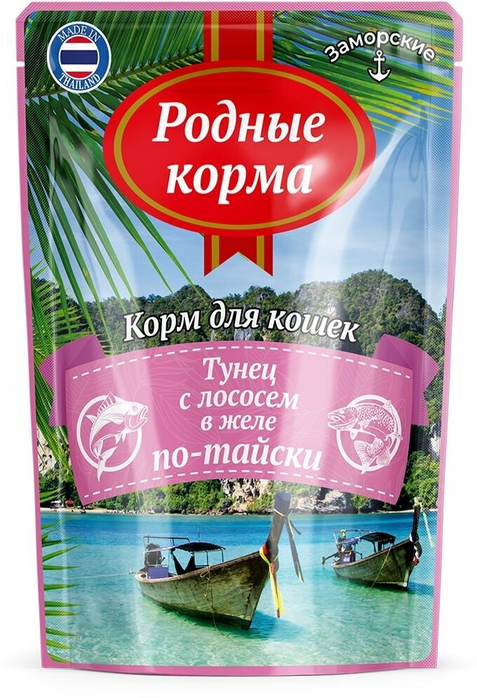 Влажный корм для кошек Родные корма Заморские Тунец и курица с лососем в желе по-тайски 70г полезный рацин