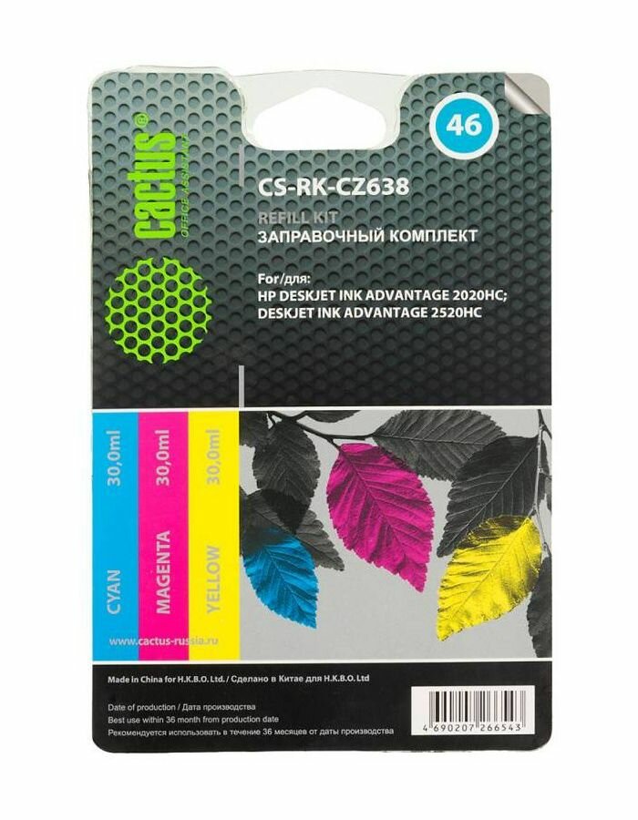 Cactus - заправочный комплект для струйных принтеров HP DeskJet 2020 и DeskJet 2520. Цвет чернил: голубой, пурпурный, желтый. На водяной основе. В упаковке 3 флакона по 30 мл.
