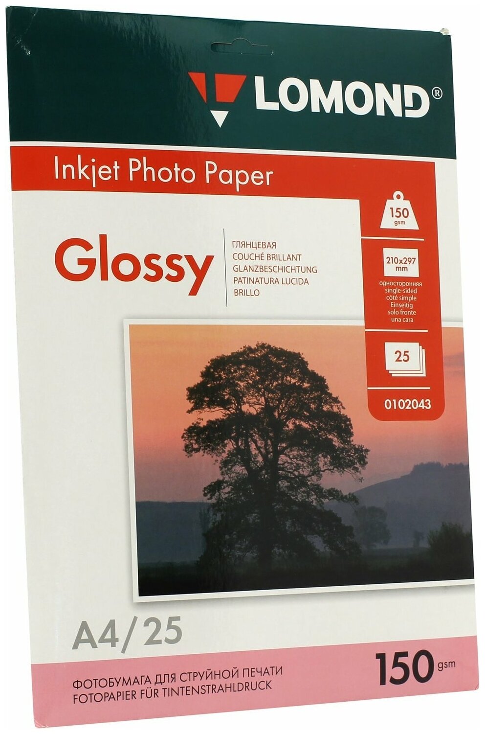 Фотобумага Lomond формат A4, плотность 150г/м2, 25 листов, односторонняя, покрытие глянцевое, для струйной печати, белый ()