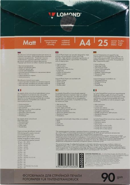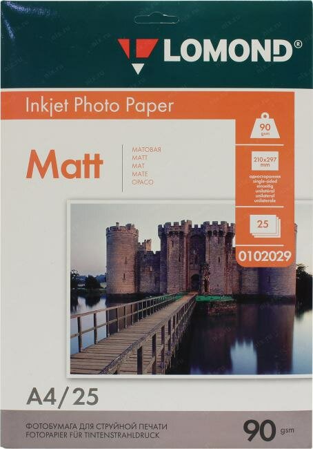 Фотобумага Lomond формат A4, плотность 90г/м2, 25 листов, односторонняя, покрытие матовое, для струйной печати, белый ()