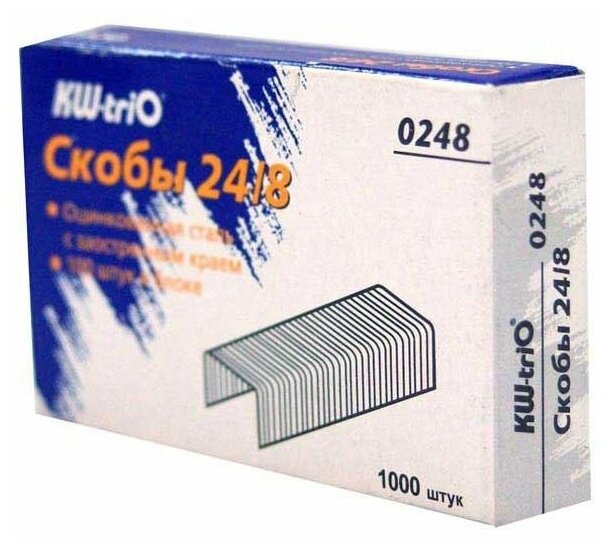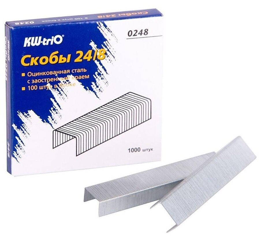 Скобы для степлера Kw-Trio № 24/8 предназначены для степлеров со сшивающей способностью от 30 до 50 листов. Скобы № 24 выполнены оцинкованной стали. 1000 скоб в картонной пачке.