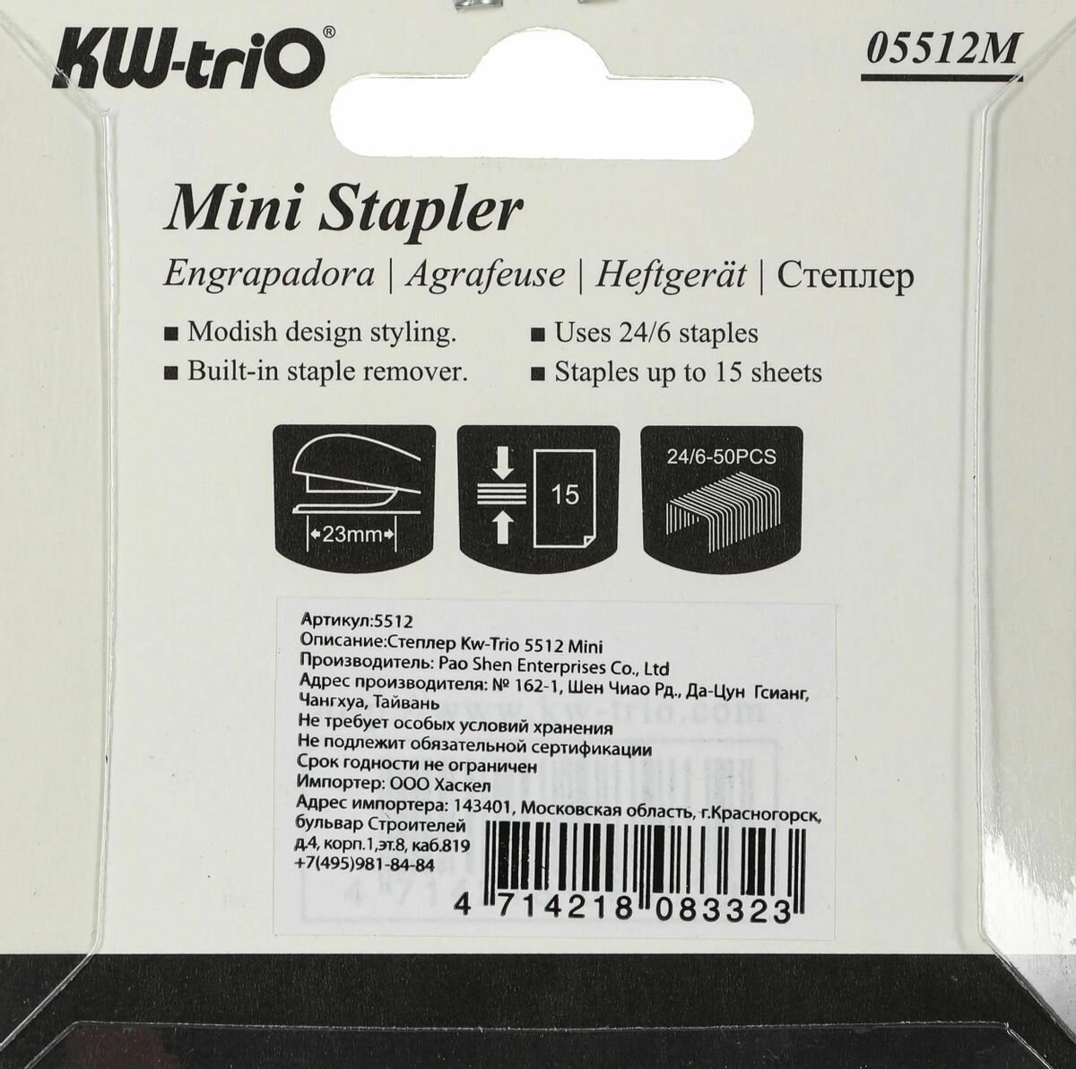 Степлер Kw-Trio Mini 24/6 26/6 (15листов) встроенный антистеплер ассорти 50скоб блистер 5512