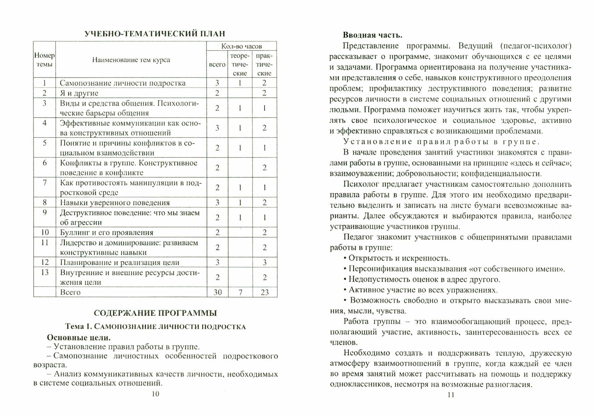 Программа включает цикл из 30 занятий по актуальным блокам: "самопознание", "межличностное взаимодействие", "конфликты и манипуляции в общении", "деструктивное поведение и буллинг", "лидерство и достижение цели". Каждое занятие включает информационный и практический блоки с заданиями и упражнениями, направленными на самодиагностику, отработку и закрепление навыков самопознания и взаимодействия, решение ситуационных задач индивидуально и в микро-группах.
