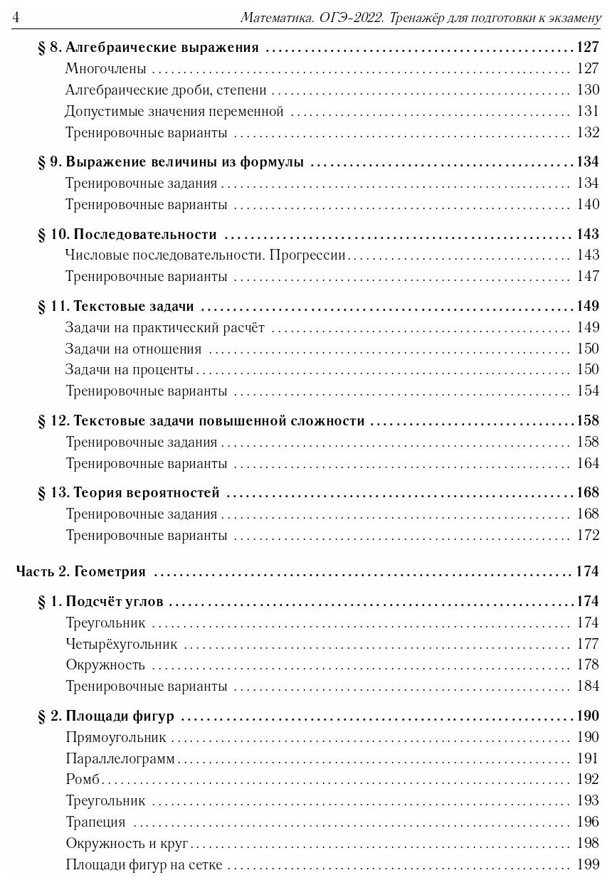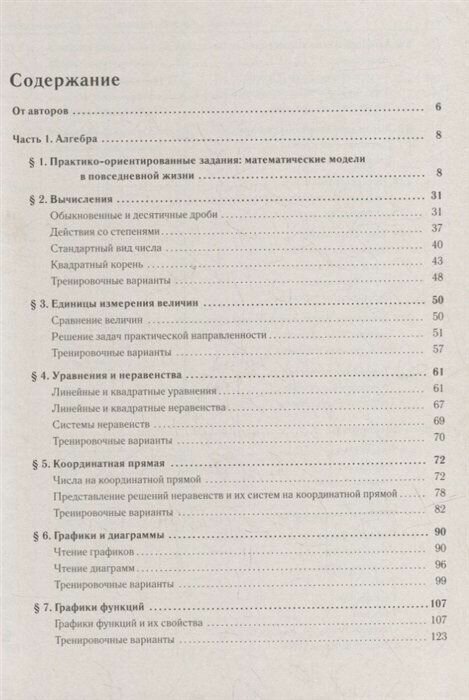 Задания пособия сгруппированы по следующим разделам школьной программы: "Задачи практической направленности", "Числа", "Буквенные выражения", "Преобразование выражений", " Уравнения", "Неравенства", "Функции и графики", "Последовательности и прогрессии", "Элементы теории вероятностей и статистика", "Текстовые задачи", "Планиметрия".