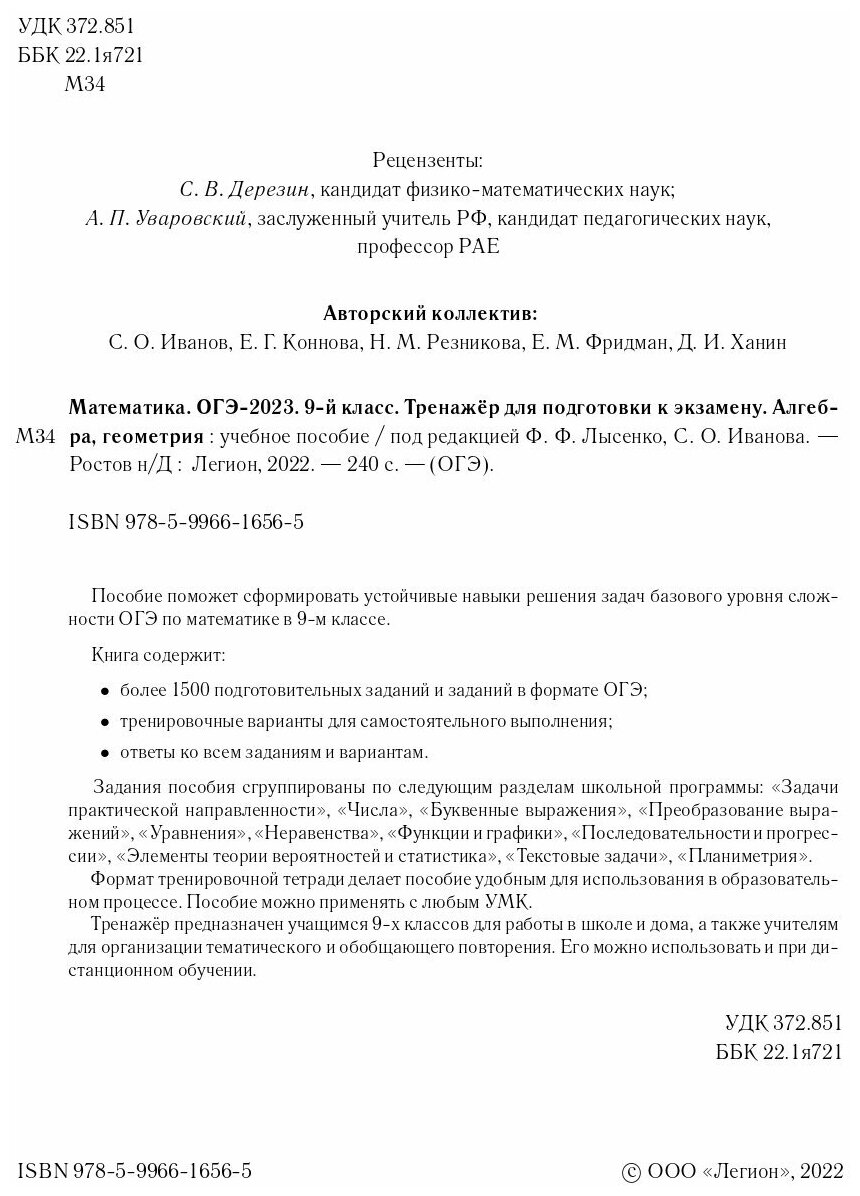 Математика ОГЭ-2023 9-й класс Тренажер для подготовки к экзамену Алгебра геометрия учебное пособие (Коннова Елена Генриевна (соавтор), Иванов Сергей Олегович, Резникова Нина Михайловна (соавтор)); Легион, 2022