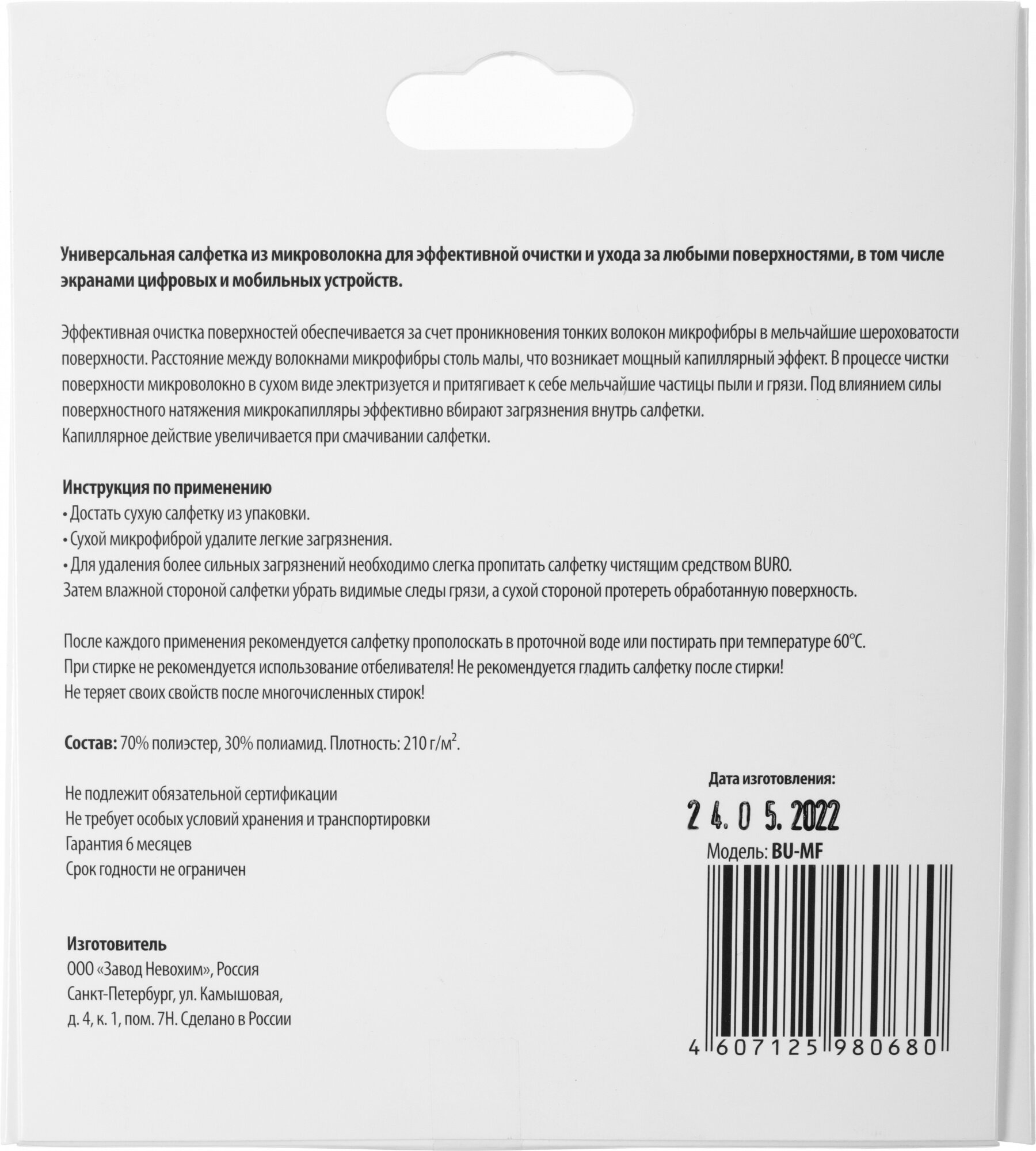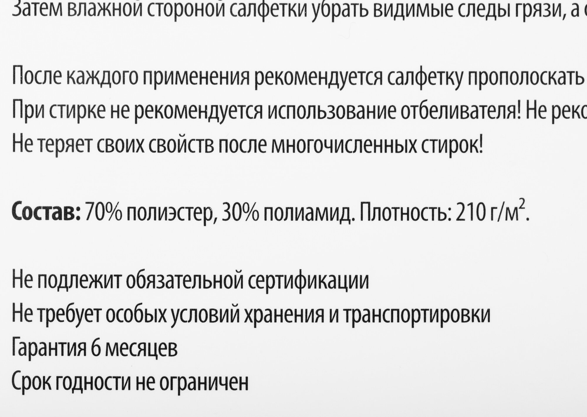 | Дополнительно | Высокое качество очистки любых гладких поверхностей. Салфетка чистит, впитывает влагу и полирует поверхность одновременно. Можно стирать до 400 раз., 25 х 25 см |
