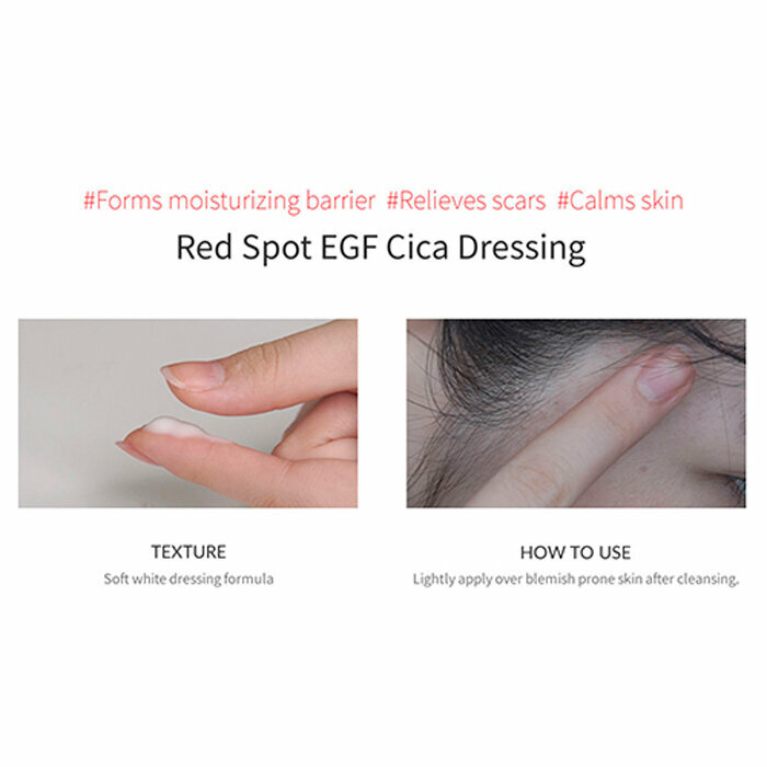 Точечный защитный крем для проблемной кожи Red Spot EGF Cica Dressing содержит бетаин, EGF, пантенол, экстракт центеллы азиатской, экстракт солодки. Образует на поверхности кожи тонкую защитную пленку, предотвращающую попадание на воспаленный участок кожи микробов, жира и грязи. Обладает лечебным действием. Успокаивает, снимает стресс и кожный зуд. Препятствует появлению пост-акне. Способствует равномерному заживлению кожи.