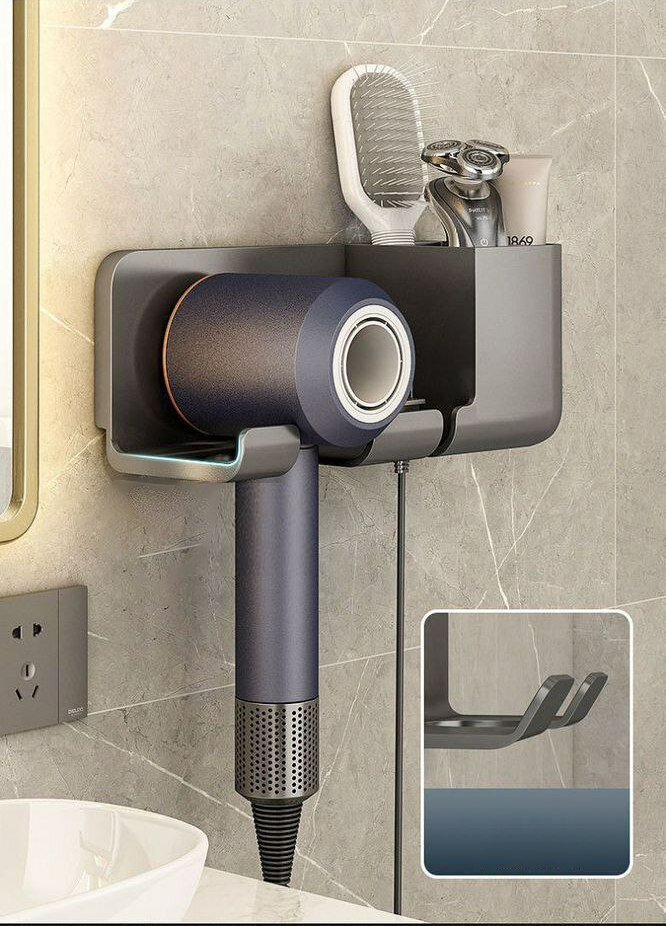 Держатель для фена без сверления в ванную комнату "черный" - функциональный и стильный аксессуар, который поможет организовать пространство в ванной комнате. Изготовлен из прочного авиационного пластика, он обеспечивает долговечность и надежность использования.Компактные размеры (ширина 9 см, длина 22 см и высота 9 см) позволяют не занимать много места, но при этом обеспечивают достаточное пространство для хранения фена и других аксессуаров.Особенностью данного держателя является его крепление без сверления и порчи стен. В комплекте идет экологически чистый двухсторонний скотч, который надежно удерживает держатель на стене. Установка держателя не требует специальных навыков и инструментов, что делает его удобным для самостоятельного монтажа.Держатель оснащен полкой, на которой можно хранить не только фен, но и другие аксессуары, такие как бритвы, расчески и кисти. Стакан для хранения расчесок и кистей легко снимается и моется, что обеспечивает гигиеничность использования.Держатель для фена "Серая" - это не только практичный аксессуар, но и стильный элемент декора, который добавит уюта и комфорта в ваш дом.