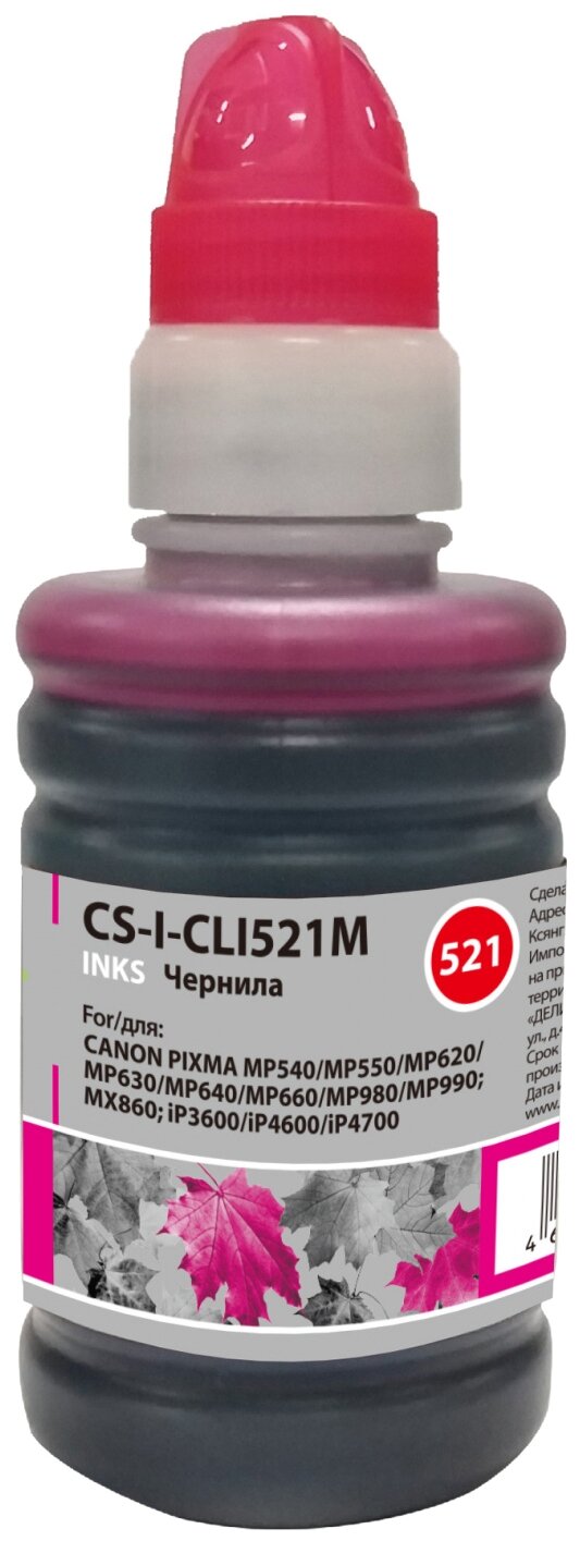 Cactus CS-CLI521М – это картридж, сделанный специально для цветных принтеров из линейки CANON PIXMA. Качество печати данного картриджа неотличимо от оригинала, при этом стоимость его в разы меньше. Для цветных принтеров нужны разные цвета чернил, в данном случае перед нами чернила пурпурного цвета, сделанные на водяной основе. Объем чернил в этом картридже составляет 8 мл, то есть при заполнении страницы на 5 %, его хватит на 446 страниц.