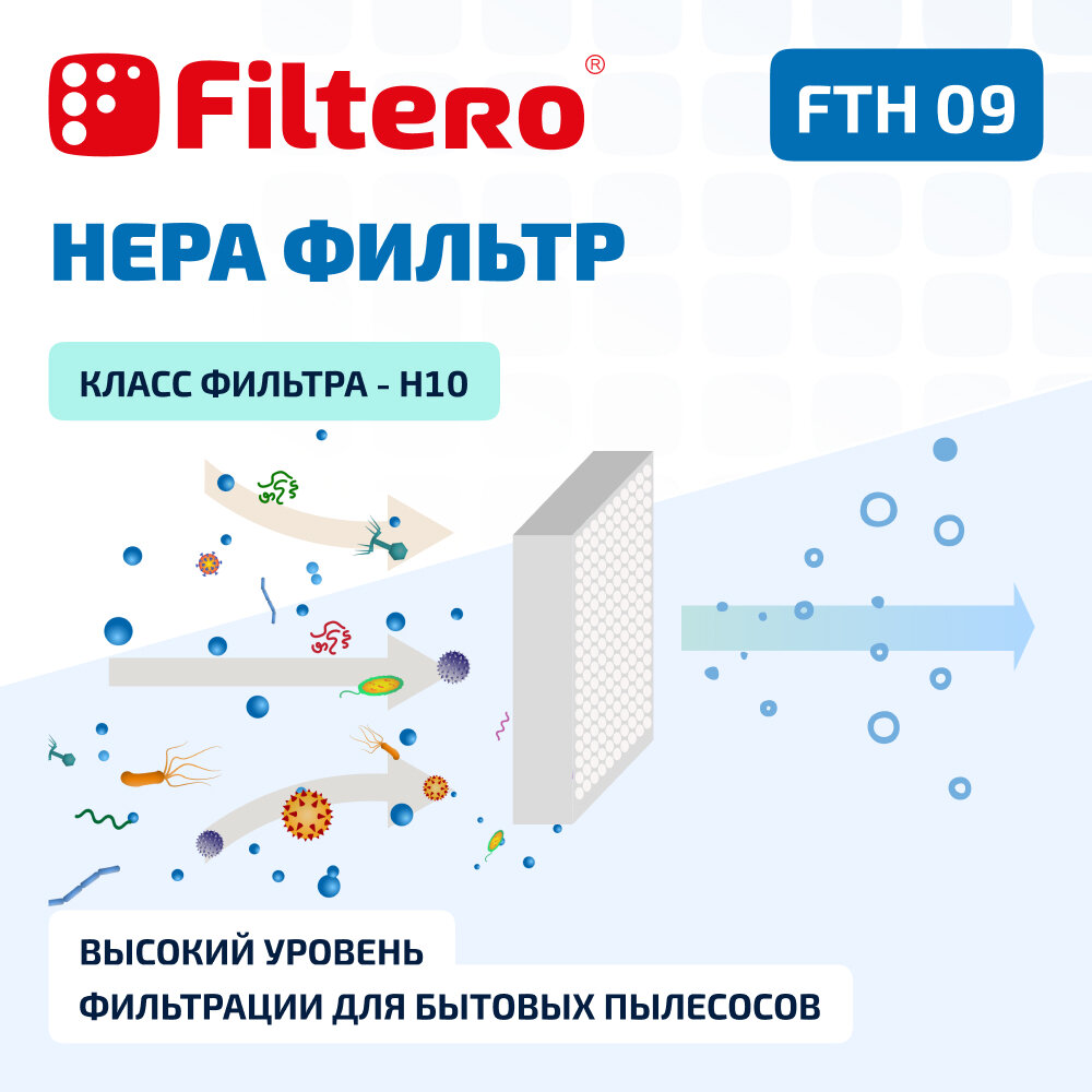 Набор фильтров Filtero FTH 09. Нера фильтр препятствует выходу мельчайших частиц пыли и аллергенов из пылесоса в помещение. Фильтр немоющийся. Подлежит замене, согласно рекомендации производителя пылесосов - не реже одного раза за 6 месяцев. Комплектация: 1 нера фильтр уровня фильтрации нера Н 10.