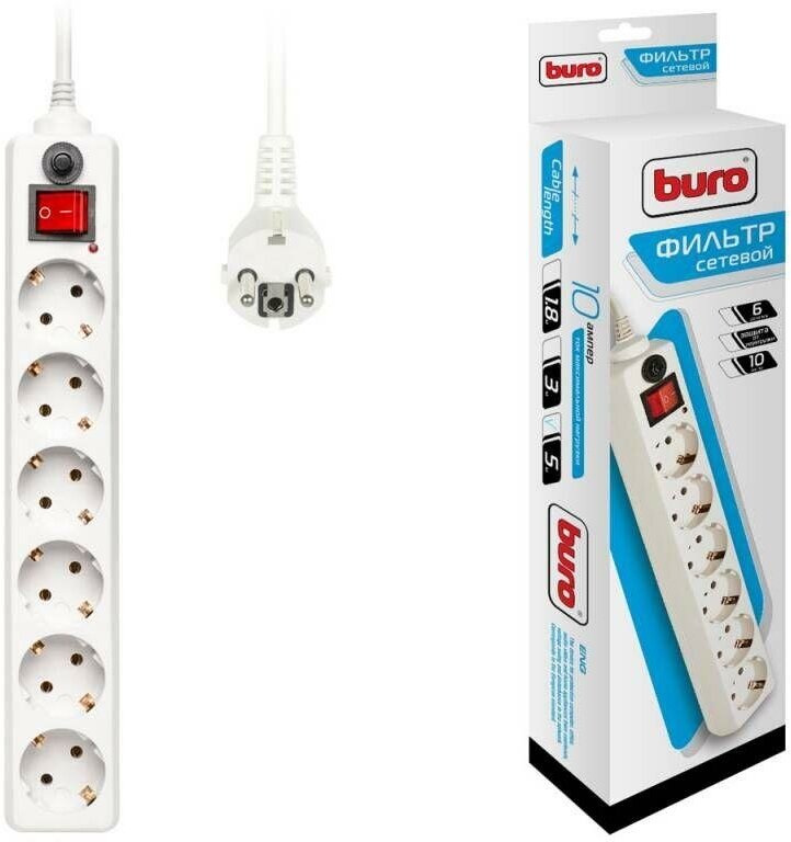 Сетевой фильтр Buro рассчитан на 6 розеток и предназначен для защиты теле-аудио-видео и другой электронной техники от импульсных сетевых помех. В его задачи также входит двухуровневая токовая защита. Номинальное напряжение сетевого фильтра составляет 220 - 230 В. Все розетки выполнены согласно EURO стандарту и имеют заземляющиеся контакты. Данный сетевой фильтр можно крепить на стену, длина его шнура составляет 5 м. Дополнительно сетевой фильтр модели оснащен защитой от короткого замыкания и защитой от перегрузки по току.