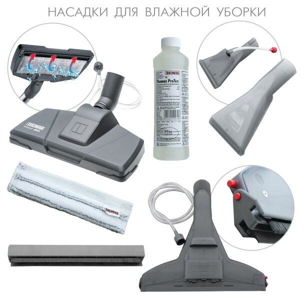 | Прочее | тип аквафильтра:aqua-box. в комплекте:насадка для чистки полов с автоматической светодиодной подсветкой для темных мест cleanlight, насадка для влажной уборки паркета и ламината thomas aqua stealth. |