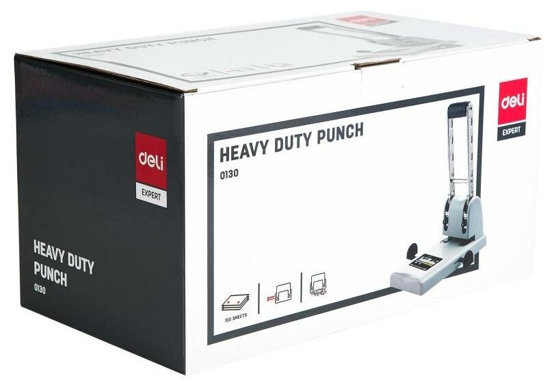 Deli Heavy Duty - мощный дырокол на 100 листов, эргономичный дизайн, выполнен из металла. Количество пробиваемых отверстий 2. Диаметр отверстий 6 мм. Расстояние между отверстиями 80 мм. Цвета в ассортименте: черный, серый.