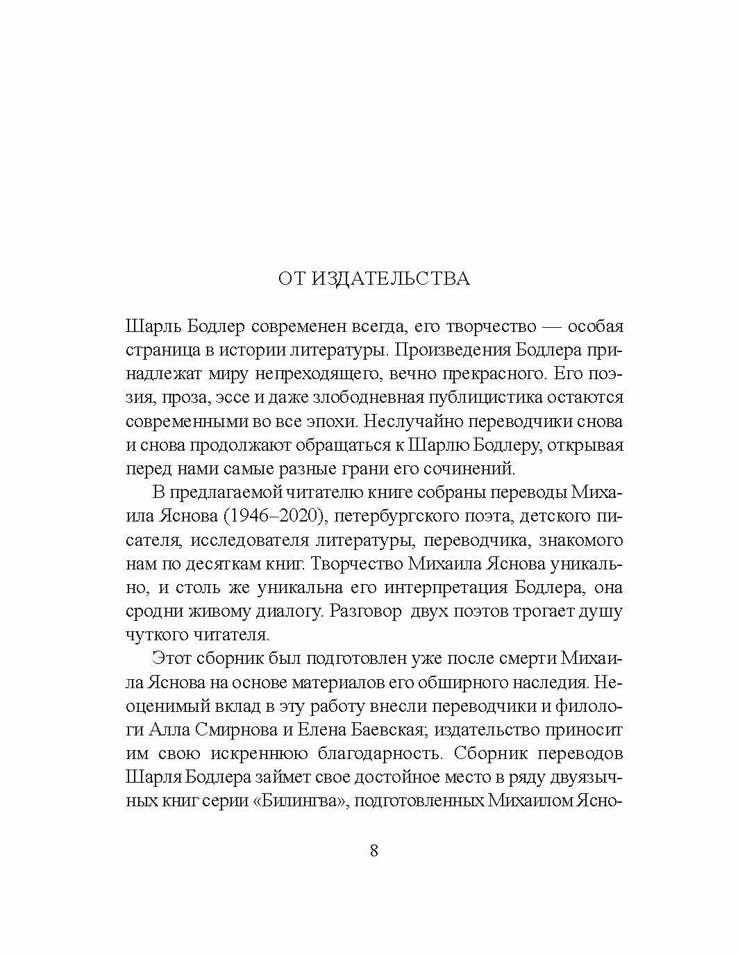 Сборник переводов Шарля Бодлера займет свое достойное место в ряду двуязычных книг серии "Билингва", подготовленных Михаилом Ясновым, среди которых произведения Аполлинера, Сандрара, Малларме, Рембо, Верлена, Валери, Кокто, Превера, Карема.