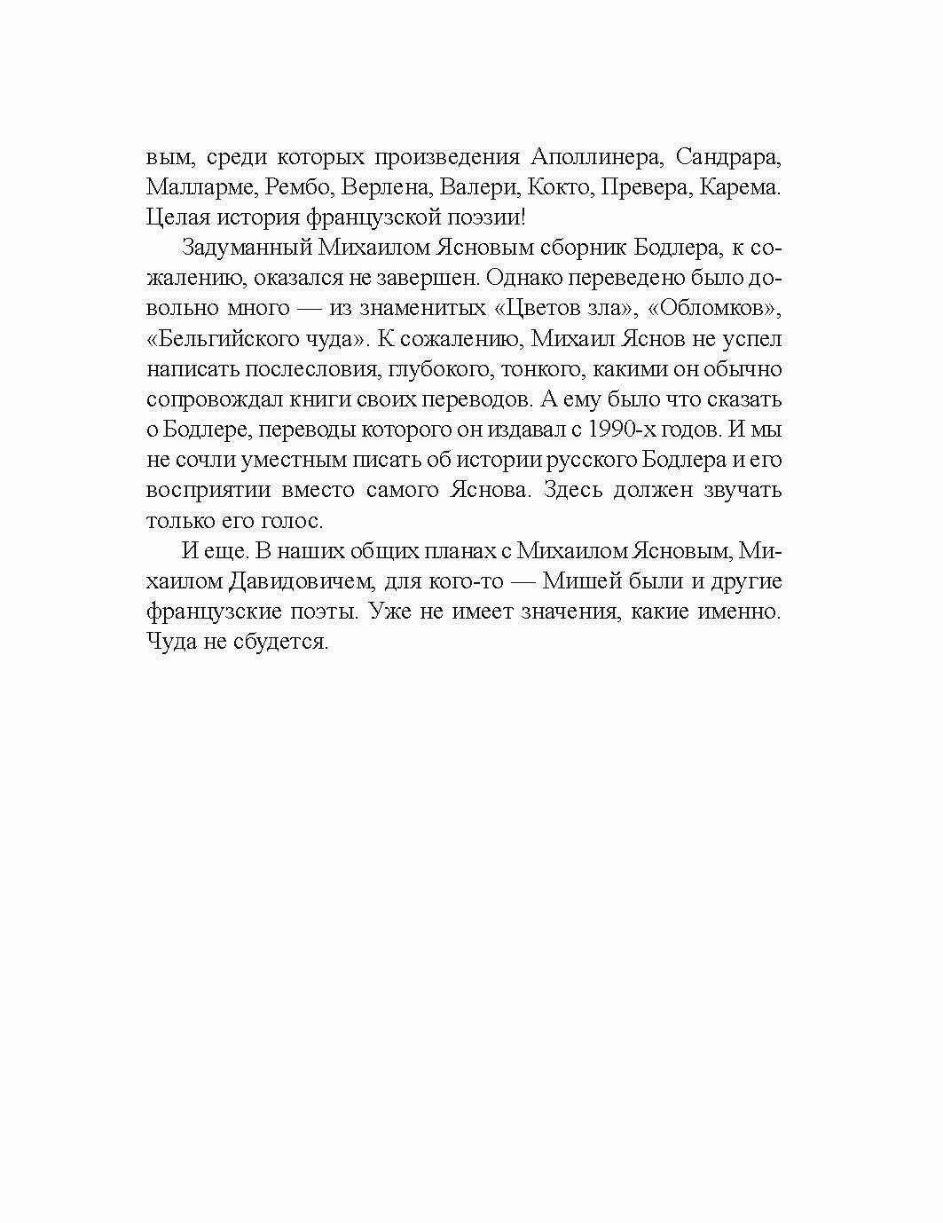 Задуманный Михаилом Ясновым сборник Бодлера, к сожалению, оказался не завершен. Однако переведено было довольно много - из знаменитых "Цветов зла", "Обломков", "Бельгийского чуда". К сожалению, Михаил Яснов не успел написать послесловия, глубокого, тонкого, какими он обычно сопровождал книги своих переводов. А ему было что сказать о Бодлере, переводы которого он издавал с 1990-х годов. И мы не сочли уместным писать об истории русского Бодлера и его восприятии вместо самого Яснова.