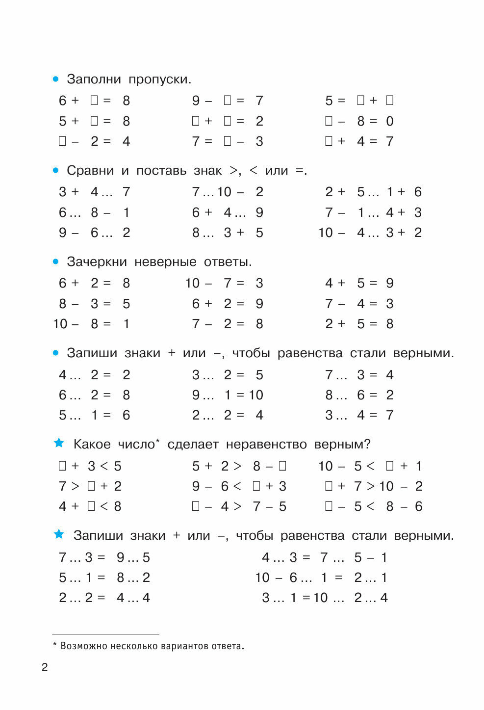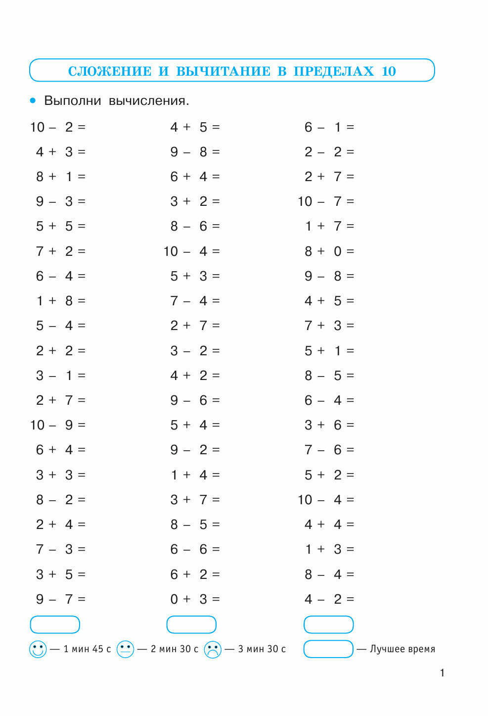 Один из лучших тренажеров счета, которые есть. Шрифт достаточно крупный, формат удобный для письма. Содержит столбики и более сложные примеры (например, написать + или -, чтобы сделать равенство верным). Сначала идёт счёт в пределах 10, потом без перехода, потом с переходом. Примеров много. В конце есть ответы на наиболее сложные примеры.