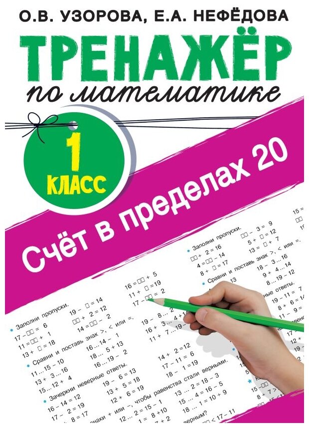 Очень хороший тренажёр приобрели сегодня на своего ребёнка, чтоб летом занимался и не растерял знания первого класса. Много примеров на сложение и вычитание в пределах 20.если задания больше-меньше. Есть задания найти ошибку. В общем, ребёнку очень и понравилось. Обложка картонная и плотная глянцевая. Шрифт крупный. Заниматься одно удовольствие. К покупке рекомендуется.