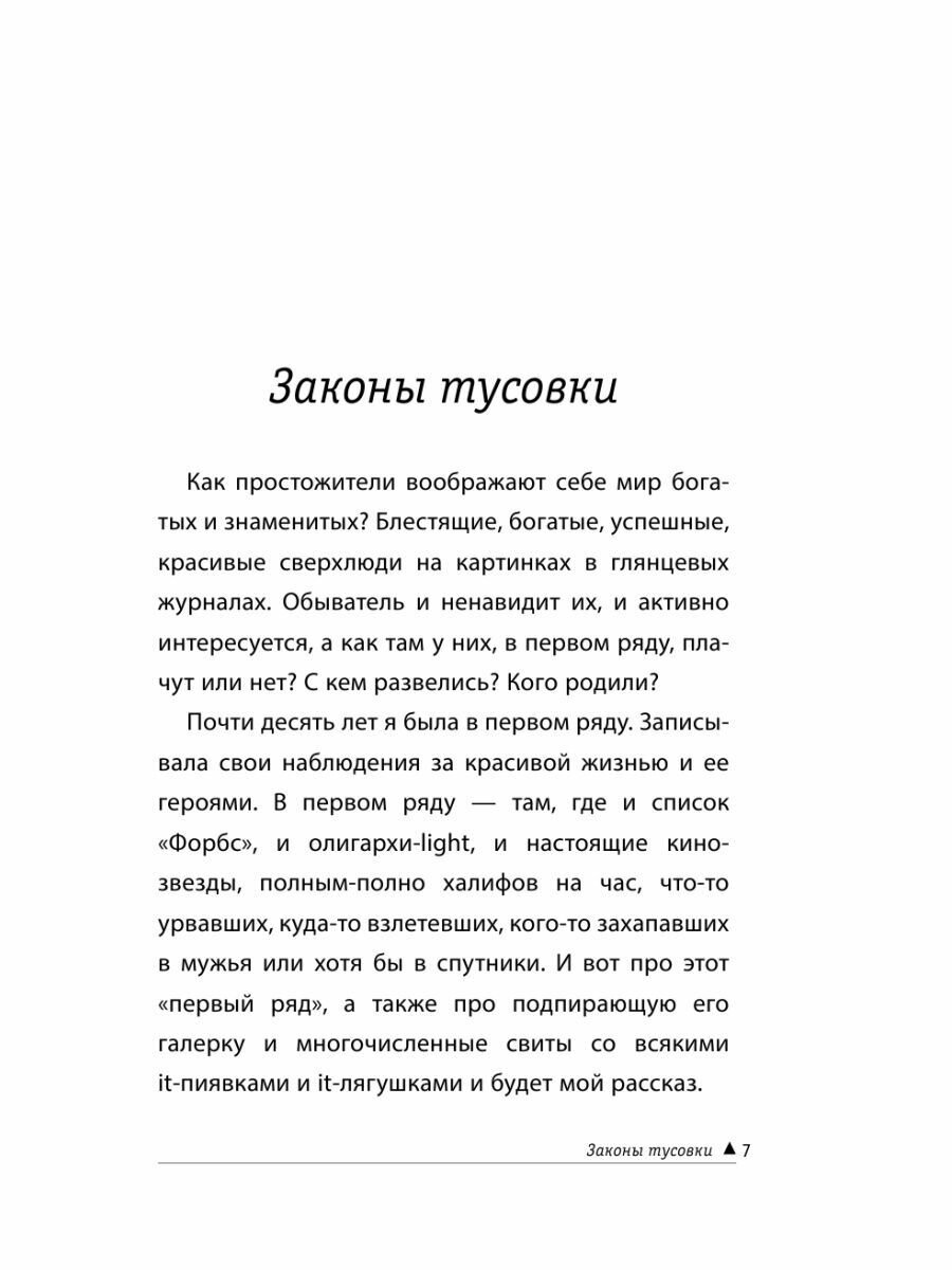 Почти десять лет я была в первом ряду. Записывала свои наблюдения за красивой жизнью и ее героями. В первом ряду — там, где и список «Форбс», и олигархи-light, и настоящие кинозвезды, полным-полно халифов на час, что-то урвавших, куда-то взлетевших, кого-то захапавших в мужья или хотя бы в спутники».