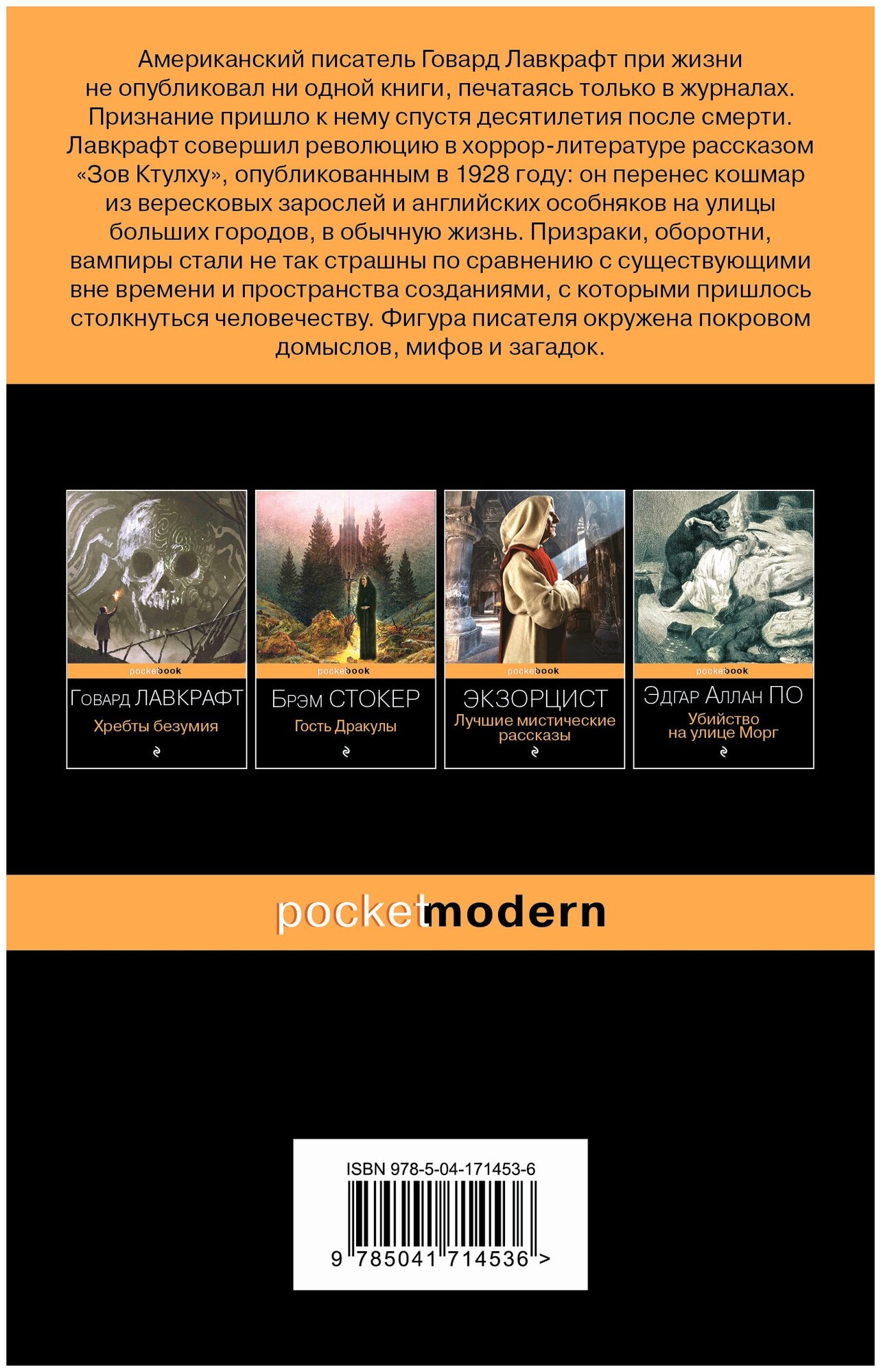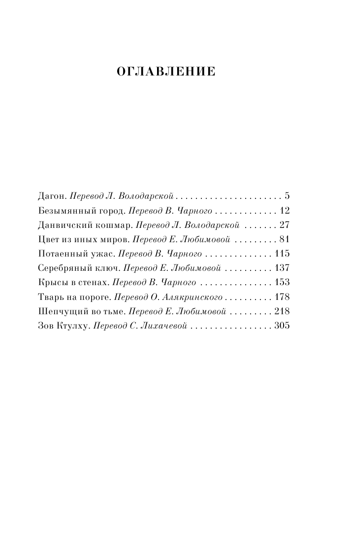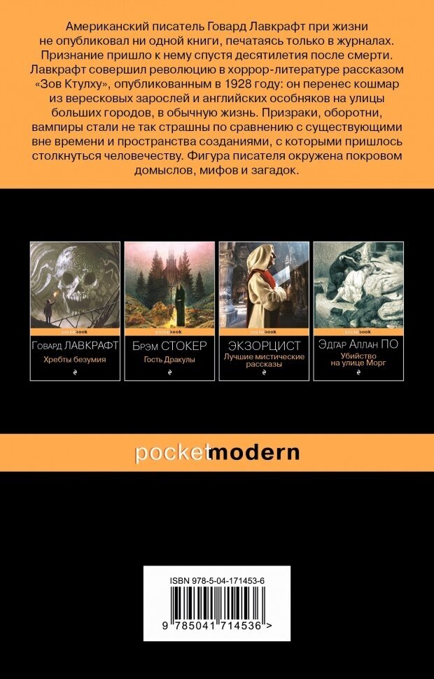 в сборник вошли самые хрестоматийные работы одного из столпов жанра "хоррор" Г.Ф. Лавкрафта... многие сюжеты и образы из представленных здесь рассказов давно уже стали элементами современной поп-культуры и даже - мемами... тем не менее - это ничуть не принижает их культовый статус... сама же книга рекомендуется исключительно для первого знакомства с творчеством автора... искушенный в жанре читатель, пожалуй, не найдет здесь ничего нового...