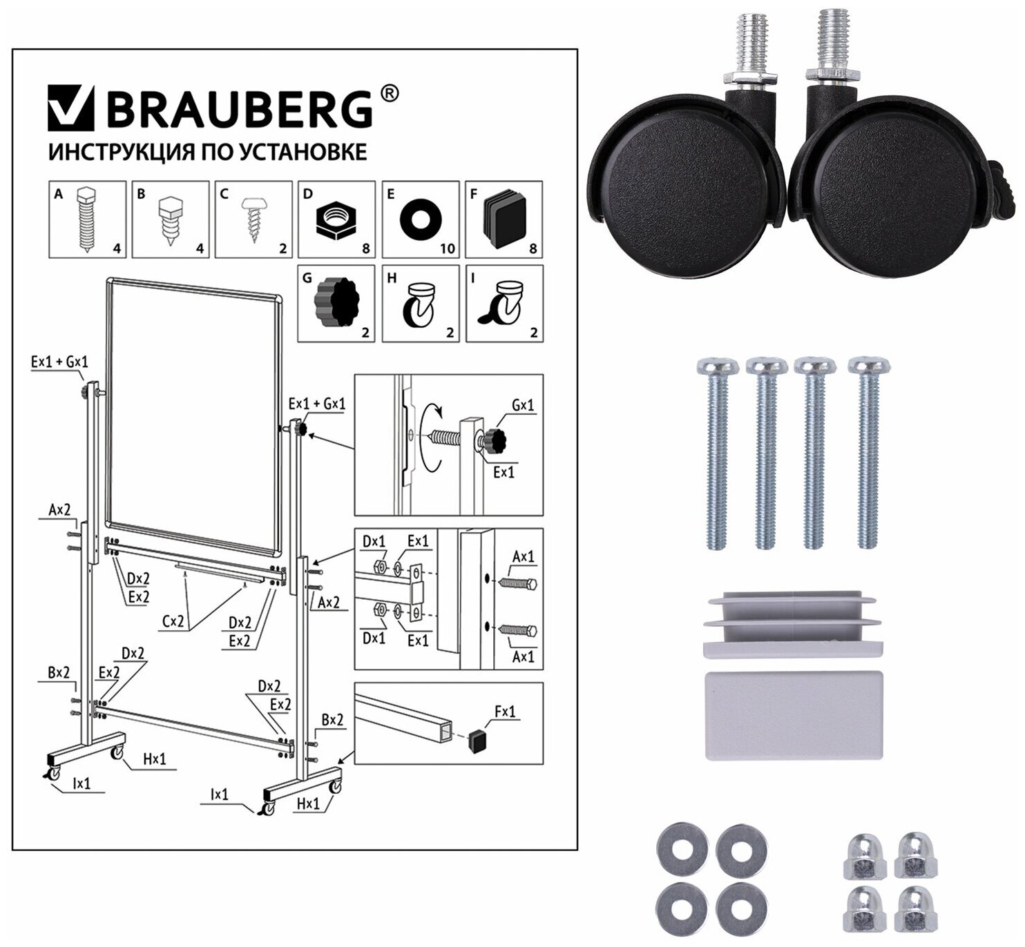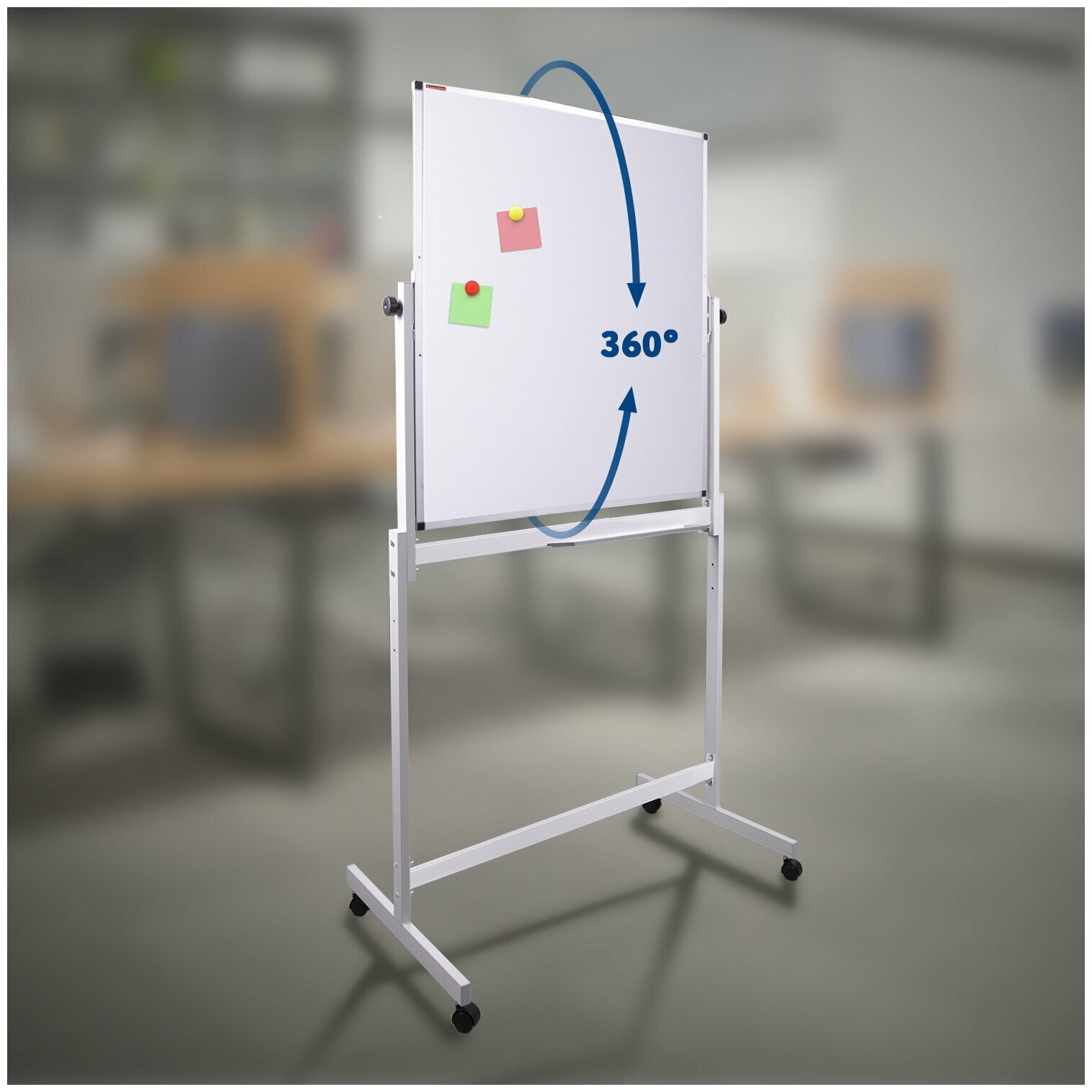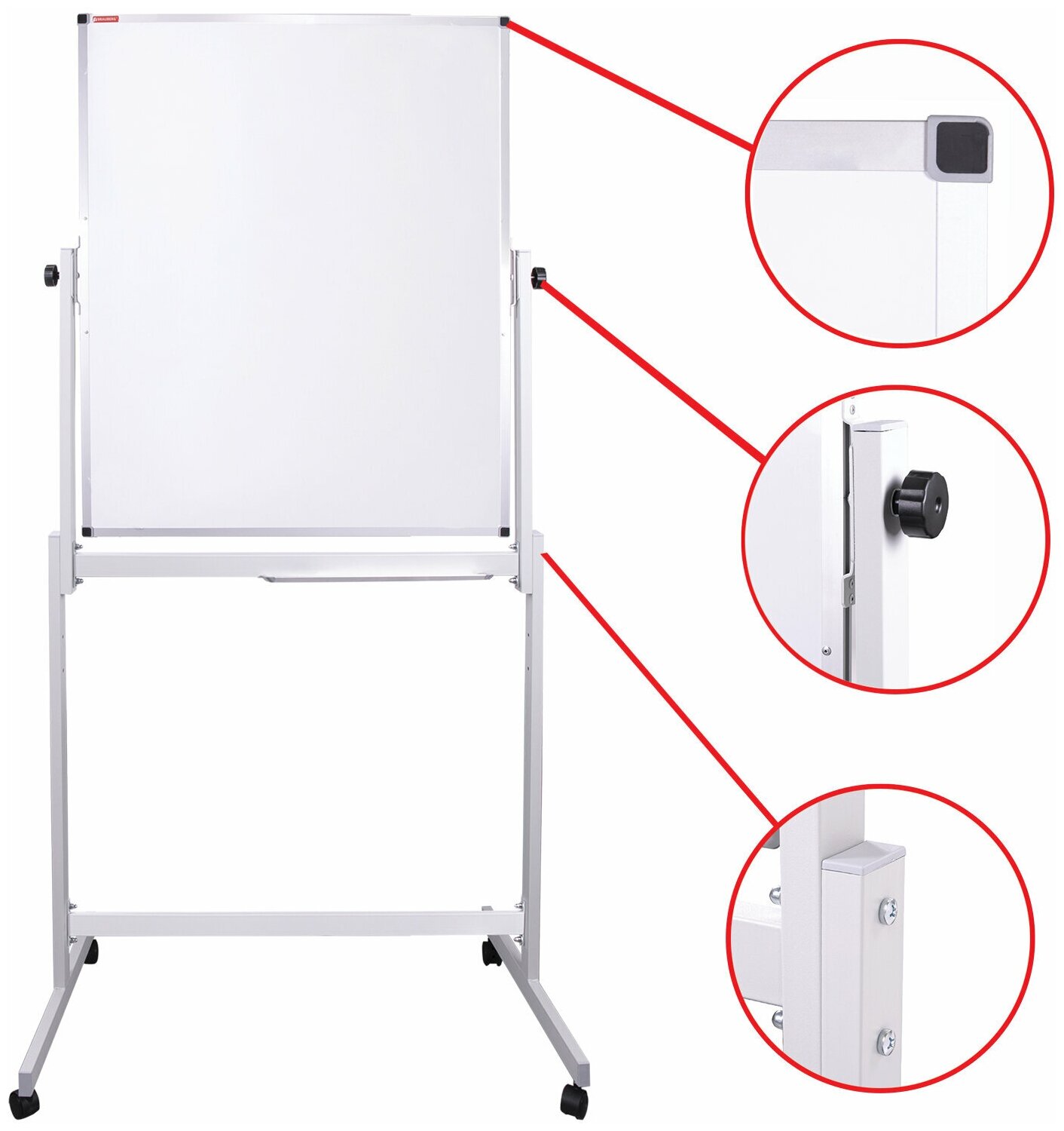 Лаковое покрытие предназначено для письма специальными маркерами для белой доски, а металлическая поверхность позволяет размещать информацию при помощи магнитов. Вращается в горизонтальной плоскости на 360°. Перемещается на колесиках. Алюминиевая рама придает доске необходимую прочность. Подставка для канцелярских принадлежностей позволяет всегда держать под рукой магниты, маркеры, стиратели и другие необходимые предметы. Элементы крепления входят в комплект. Защитная пленка предупреждает появление царапин, потертостей и сколов на рабочей поверхности доски при транспортировке и хранении продукции (перед началом работы необходимо удалить защитную пленку).