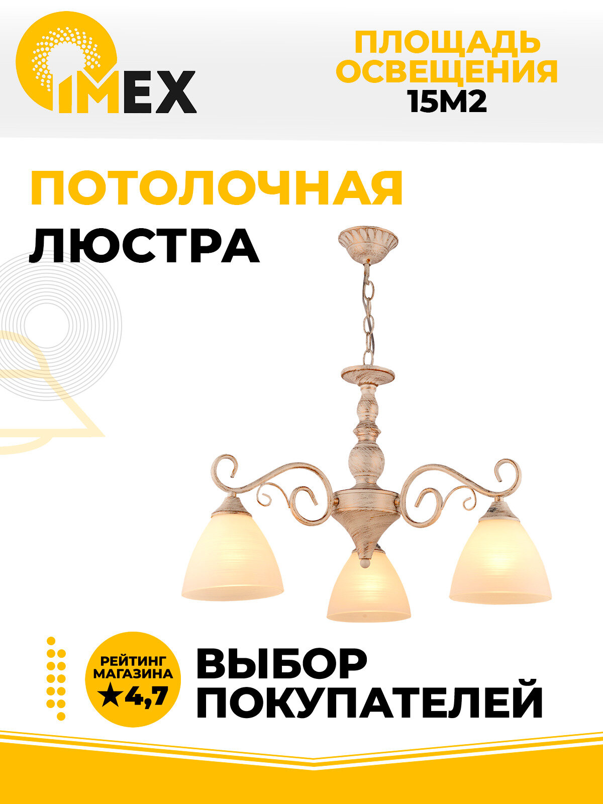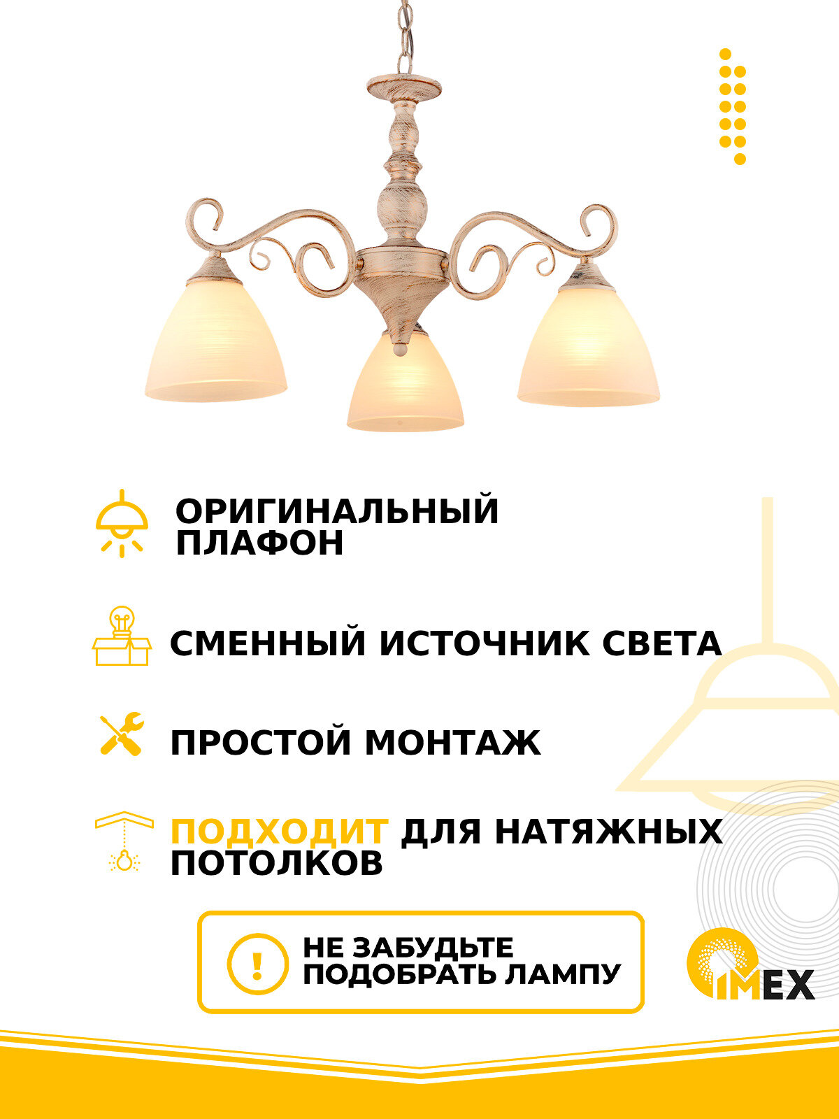 Подвесная люстра - продукт известной компании Imex (Германия). Имеет максимальную мощность 180 Вт, освещает площадь до 9 кв. м. Отлично подойдет для таких мест, как гостиная, кафе, спальня, кухня, над обеденным столом, кабинет. Впишется в интерьеры следующих стилей: классический.