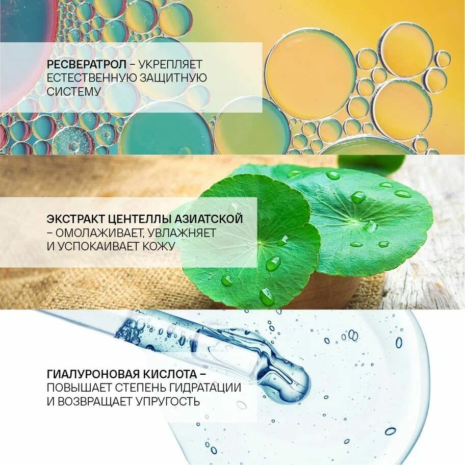 Легкий крем (лосьон) для ежедневного применения увлажняет и защищает кожу. Снимает покраснения, предотвращает окислительное повреждение, возвращает здоровое сияние. Уникальная комбинация УФ-фильтров обеспечивает надежную защиту от вредного воздействия солнечных лучей. Замедляет появление признаков преждевременного старения. Гиалуроновая кислота значительно повышает увлажненность и упругость кожи. Средство богато антиоксидантами: ресвератрол из красного вина укрепляет естественную защитную систему и помогает нейтрализовать свободные радикалы; экстракт центеллы азиатской стимулирует микроциркуляцию, омолаживает, увлажняет и успокаивает кожу.