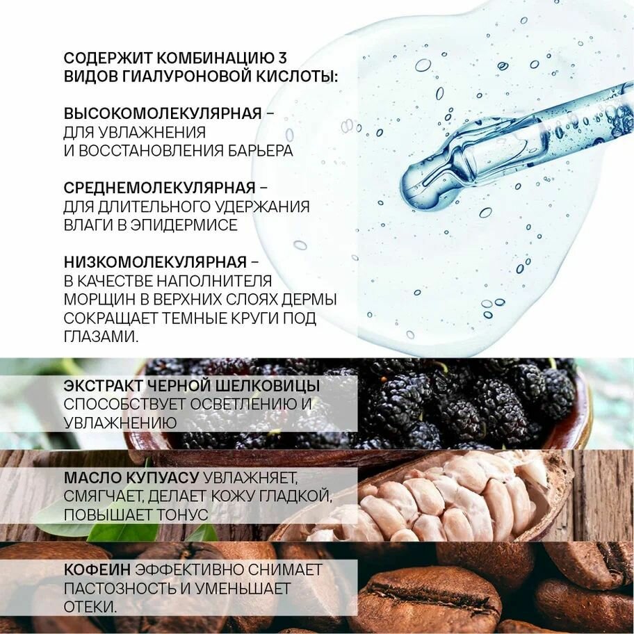 Омолаживающая маска для области вокруг глаз восстанавливает жизненную силу кожи, снимает отек и избавляет от морщин. Содержит 3 вида гиалуроновой кислоты: высокомолекулярная – для увлажнения и восстановления барьера, среднемолекулярная – для длительного удержания влаги в эпидермисе, низкомолекулярная – в качестве «филлера» для морщин в верхних слоях дермы. Сокращает темные круги под глазами. Экстракт черной шелковицы способствует осветлению и увлажнению. Масло купуасу увлажняет, смягчает, делает кожу гладкой, повышает тонус. Кофеин эффективно снимает пастозность и уменьшает отеки.