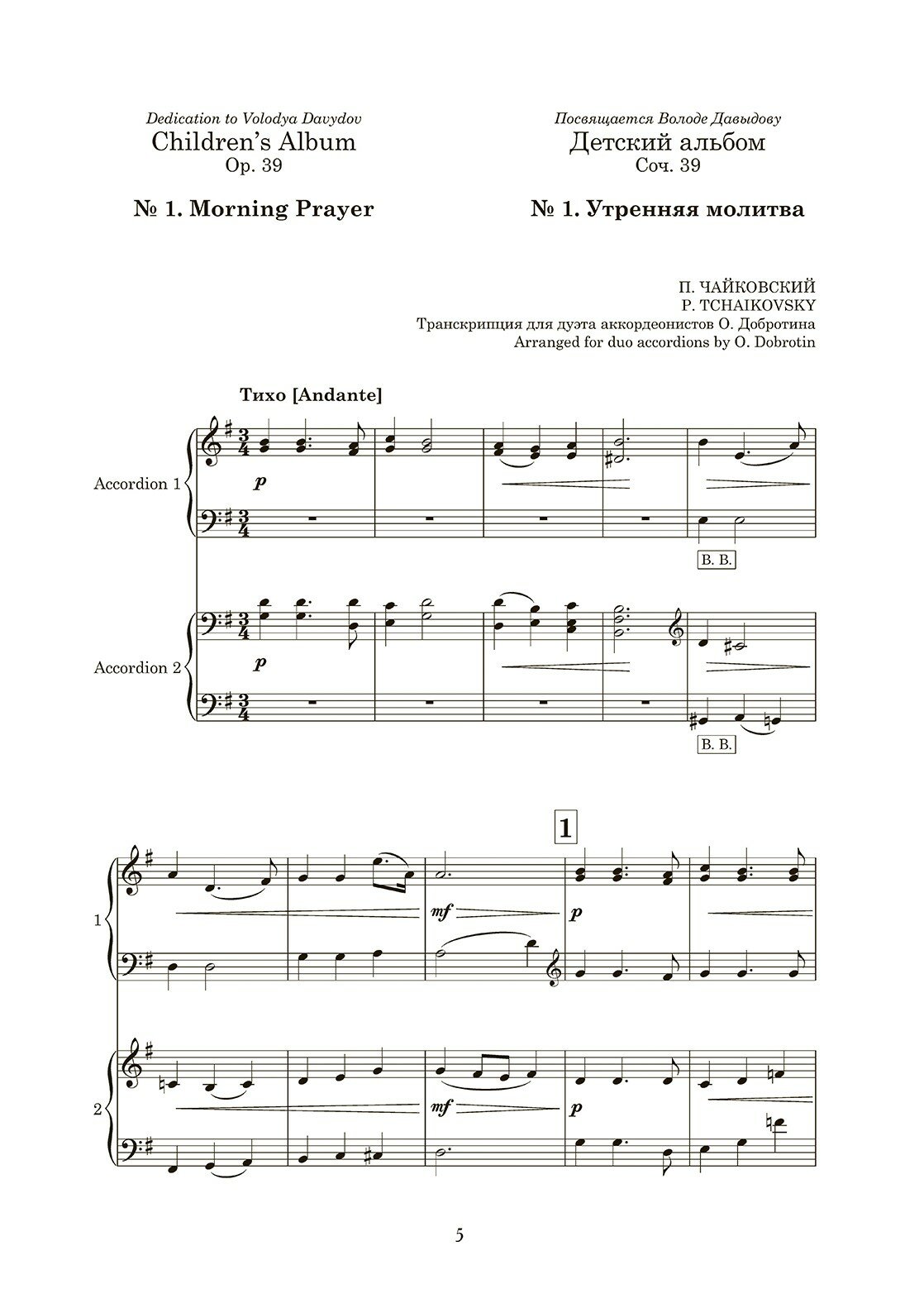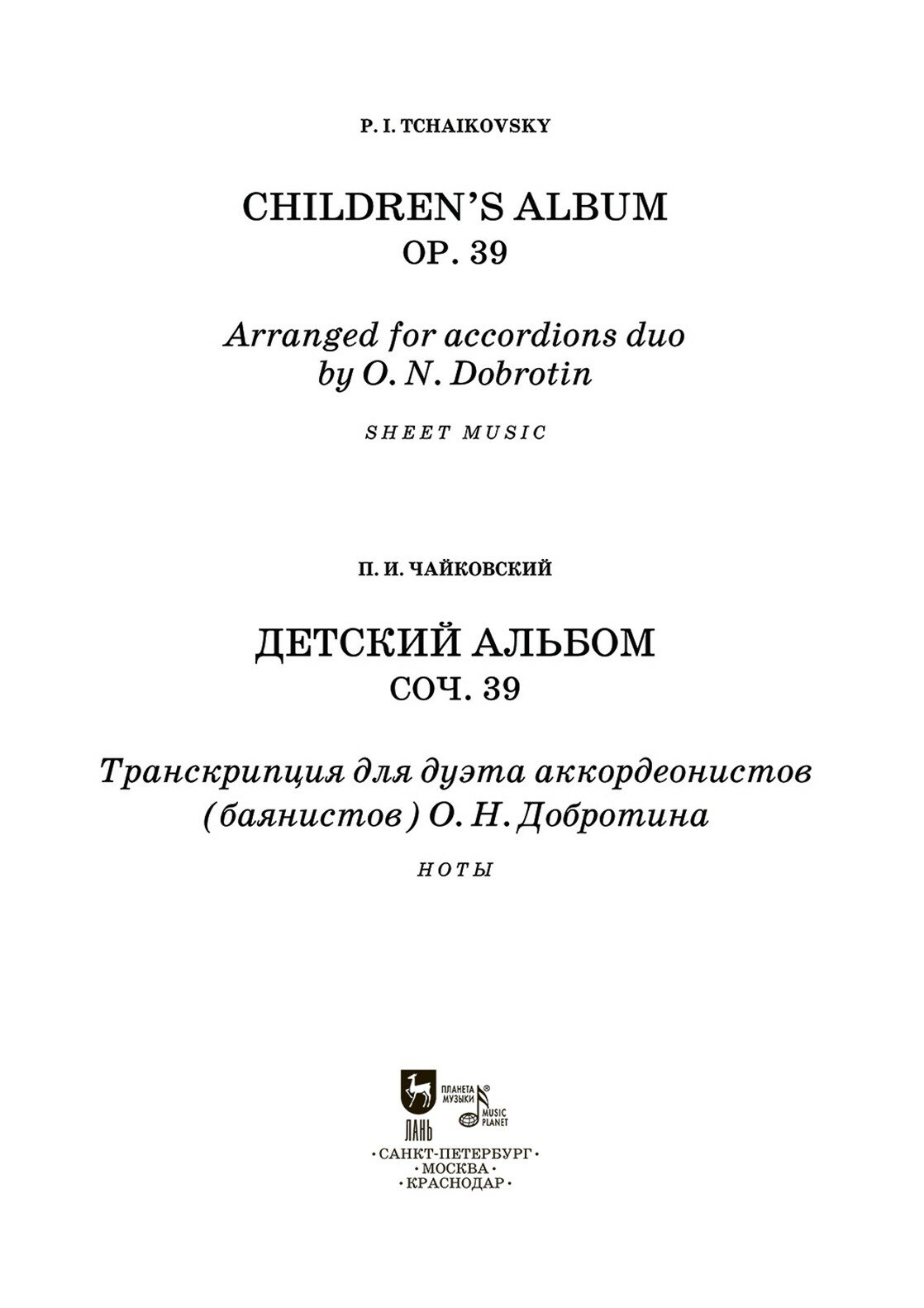 Детский альбом. Соч. 39. Транскрипция для дуэта аккордеонистов (баянистов) О. Н. Добротина (Петр Ильич Чайковский); Издательство «Планета музыки», 2022