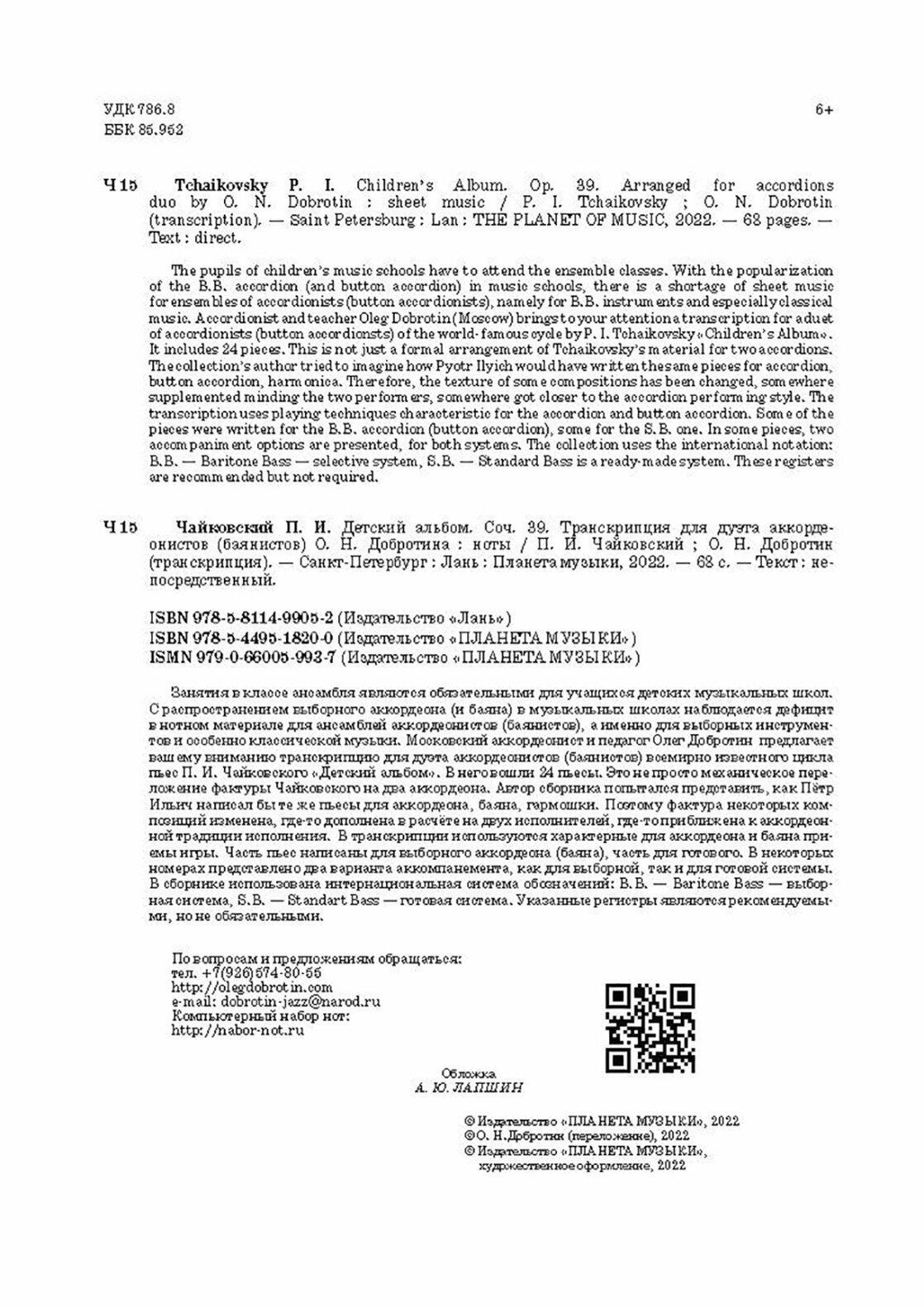 Занятия в классе ансамбля являются обязательными для учащихся детских музыкальных школ. С распространением выборного аккордеона (и баяна) в музыкальных школах наблюдается дефицит в нотном материале для ансамблей аккордеонистов (баянистов), а именно для выборных инструментов и особенно классической музыки. Московский аккордеонист и педагог Олег Добротин предлагает вашему вниманию транскрипцию для дуэта аккордеонистов (баянистов) всемирно известного цикла пьес П.И. Чайковского "Детский альбом". В него вошли 24 пьесы. Это не просто механическое переложение фактуры Чайковского на два аккордеона. Автор сборника попытался представить, как Пётр Ильич написал бы те же пьесы для аккордеона, баяна, гармошки. Поэтому фактура некоторых композиций изменена, где-то дополнена в расчёте на двух исполнителей, где-то приближена к аккордеонной традиции исполнения. В транскрипции используются характерные для аккордеона и баяна приемы игры. Часть пьес написаны для выборного аккордеона (баяна), часть для готового. В некоторых номерах представлено два варианта аккомпанемента, как для выборной, так и для готовой системы. В сборнике использована интернациональная система обозначений: B.B. - Baritone Bass - выборная система, S.B. - Standart Bass - готовая система. Указанные регистры являются рекомендуемыми, но не обязательными.