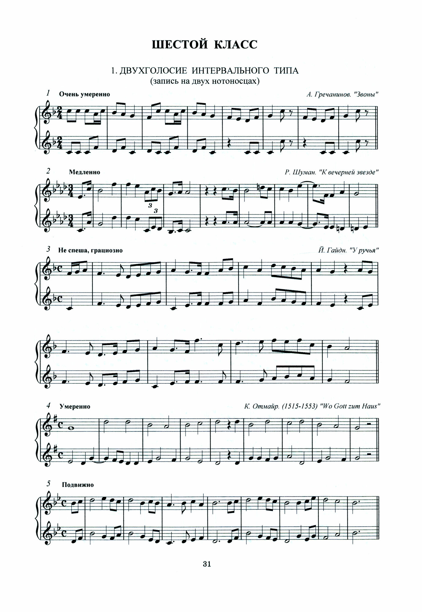 "Двухголосные диктанты" состоят из шести разделов и позволяют охватить все технологические трудности, возникающие в процессе учёбы. Серьёзная, планомерная работа над записью двухголосия начинается, как правило, в четвёртом классе и заканчивается в выпускном, с постепенным наращиванием трудностей. Сложный двухголосный диктант является выпускным в музыкальном колледже и экзаменационным при приёме в музыкальные ВУЗы России.