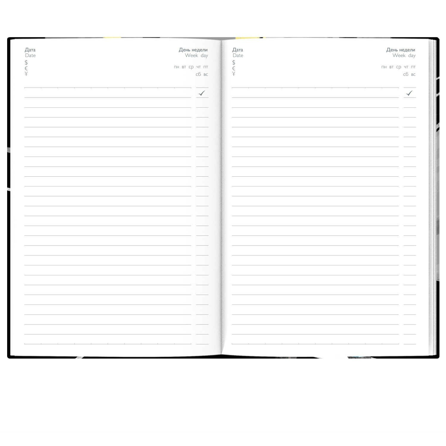 Ежедневник недатированный. Формат А5. Количество листов: 80. Тип обложки - твёрдый переплёт. Отделка обложки: выборочный УФ-лак. Ламинация обложки - ламинация "софт-тач" вельвет. Материал обложки - мелованная бумага 130 г/м2. Печать обложки - полноцветная печать. Блок - белый офсет, 65 г/м2, печать в одну краску, линия. Красочность форзаца: без печати. Справочные материалы: справочный материал.
