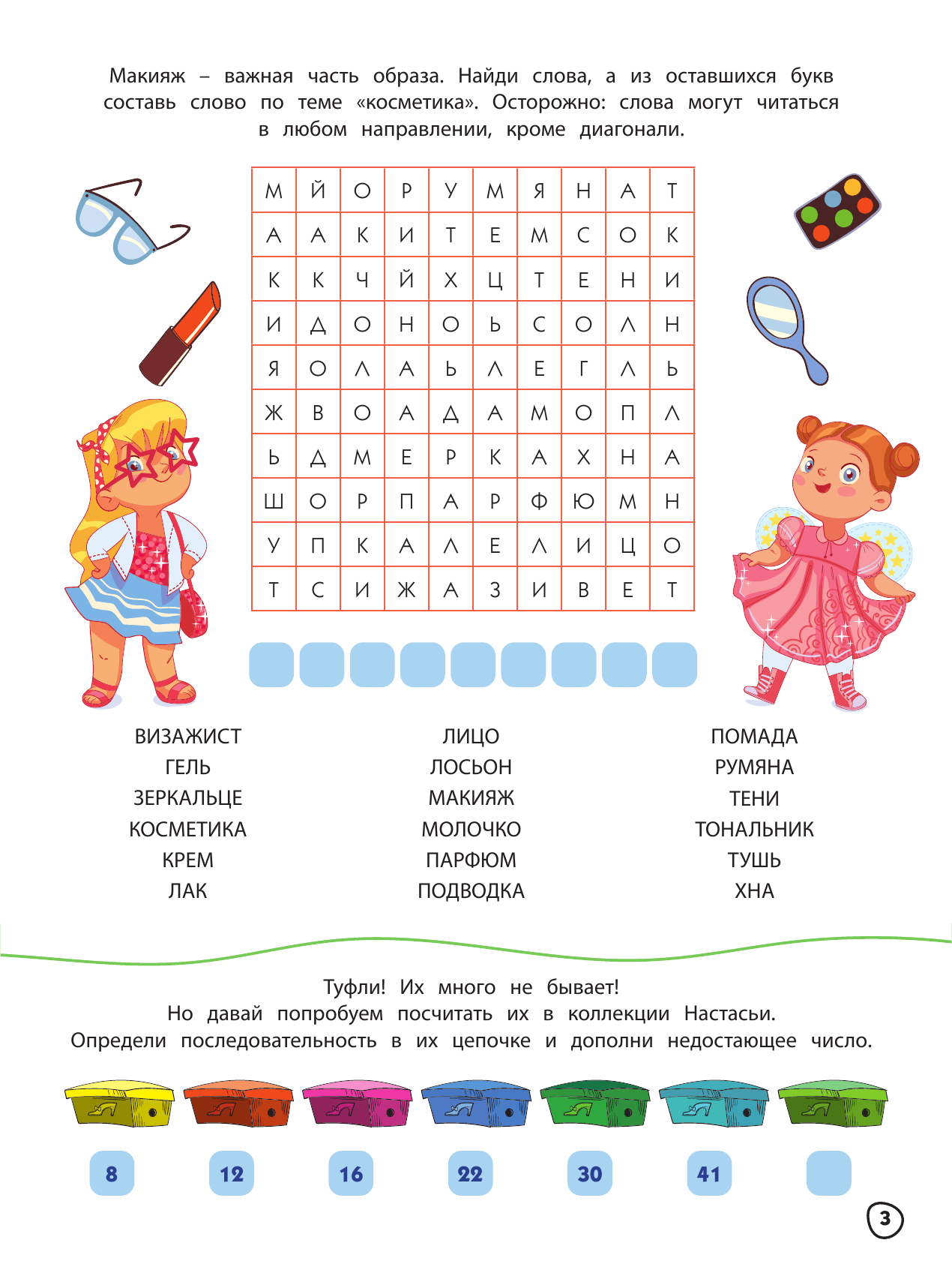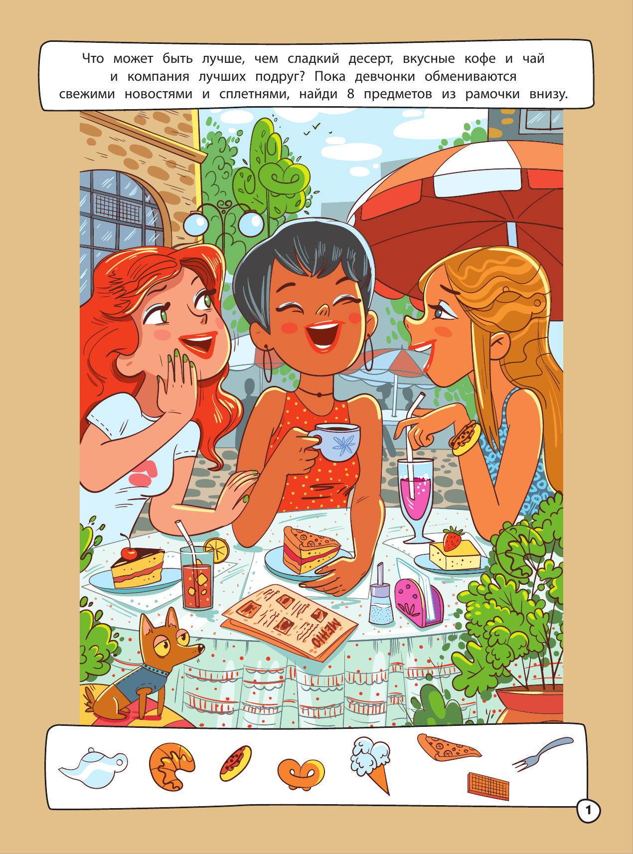 Очень яркая, красочная книжечка с играми для девочек. Много заданий по поиску предметов на большом полотне и всевозможные лабиринты, а также найти отличия. На всех страницах присутствуют иллюстрации, как маленькие, так и крупным планом. Книга получилась модной и интересной, ведь основная тема посвящена девочкам, красоте и секретикам.